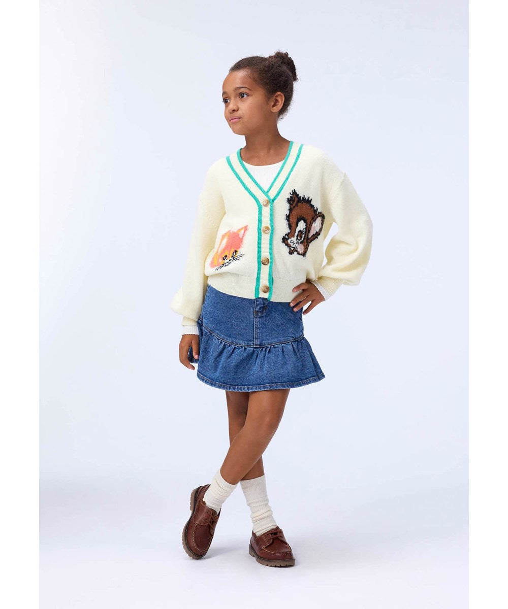 Blue denim skirt with a ruffle at the bottom. The skirt is knee-length and has both front and back pockets. It has a zip and snap button closure as well as belt loops. The waist has an internal adjustable elastic, so it can be adjusted for the right fit.