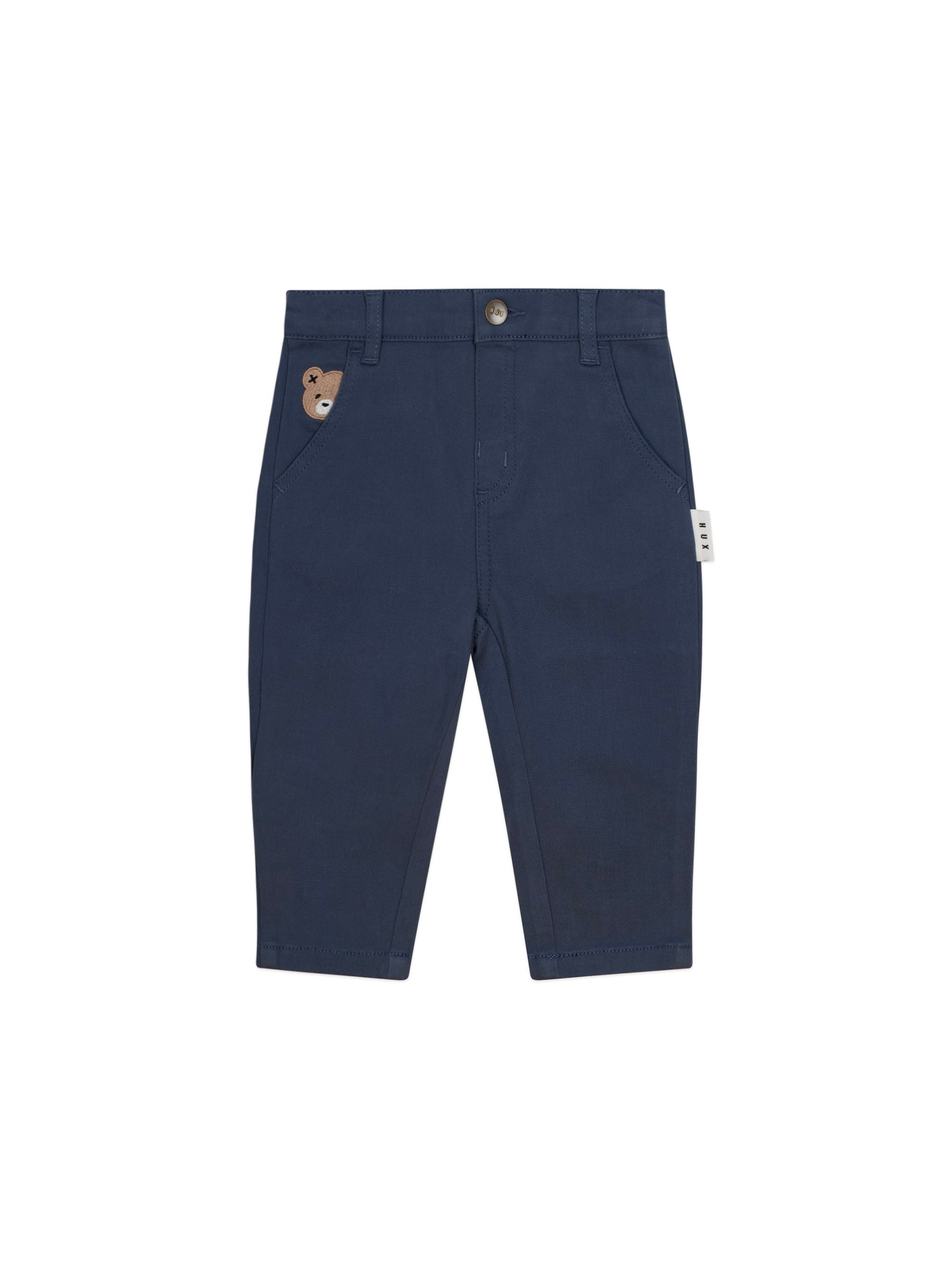 The perfect chino pant for any occasion. Dress them up or down. Made from a velvety soft, brushed cotton twill, they feature a peeping Huxbear embroidery on the pocket and an internal button waistband and belt loops for adjustable wear. Zipper fly on sizes 4 and up.