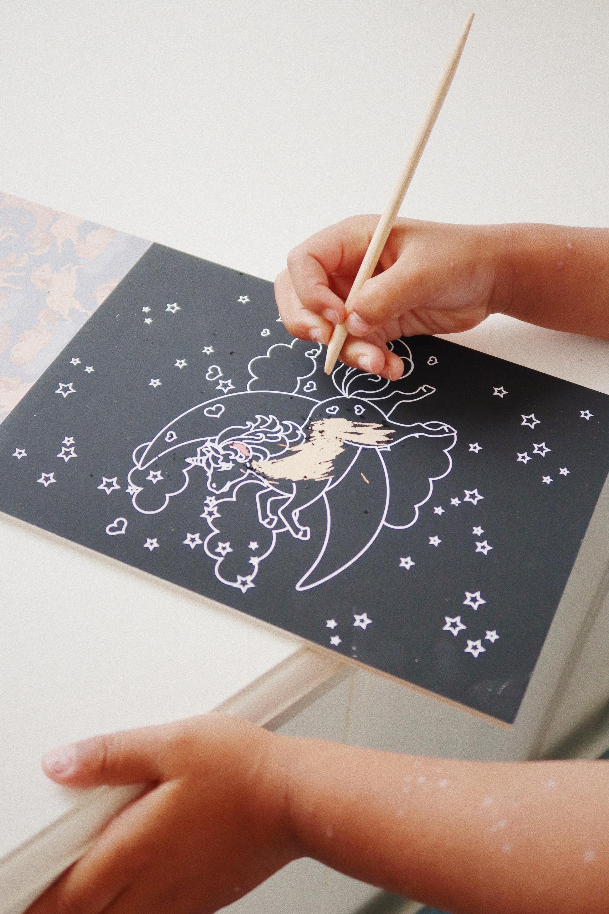 Scratch book set containing a bamboo pen for scratching and, 15 A5 scratch drawings. This product is made of bamboo and FSC™-certified and other controlled material.
