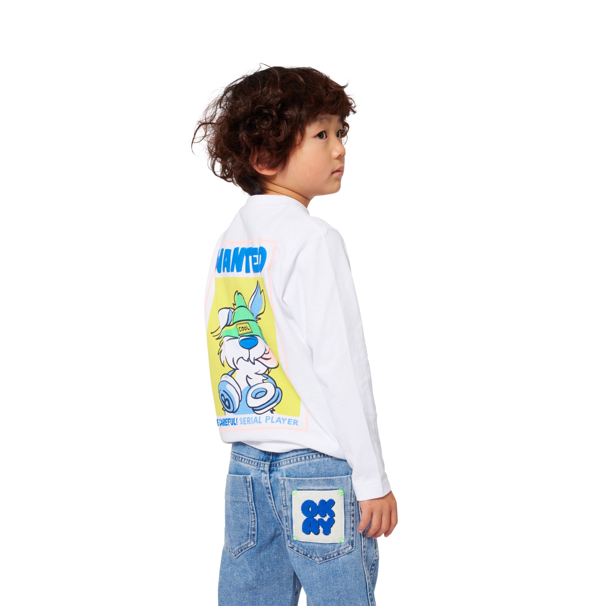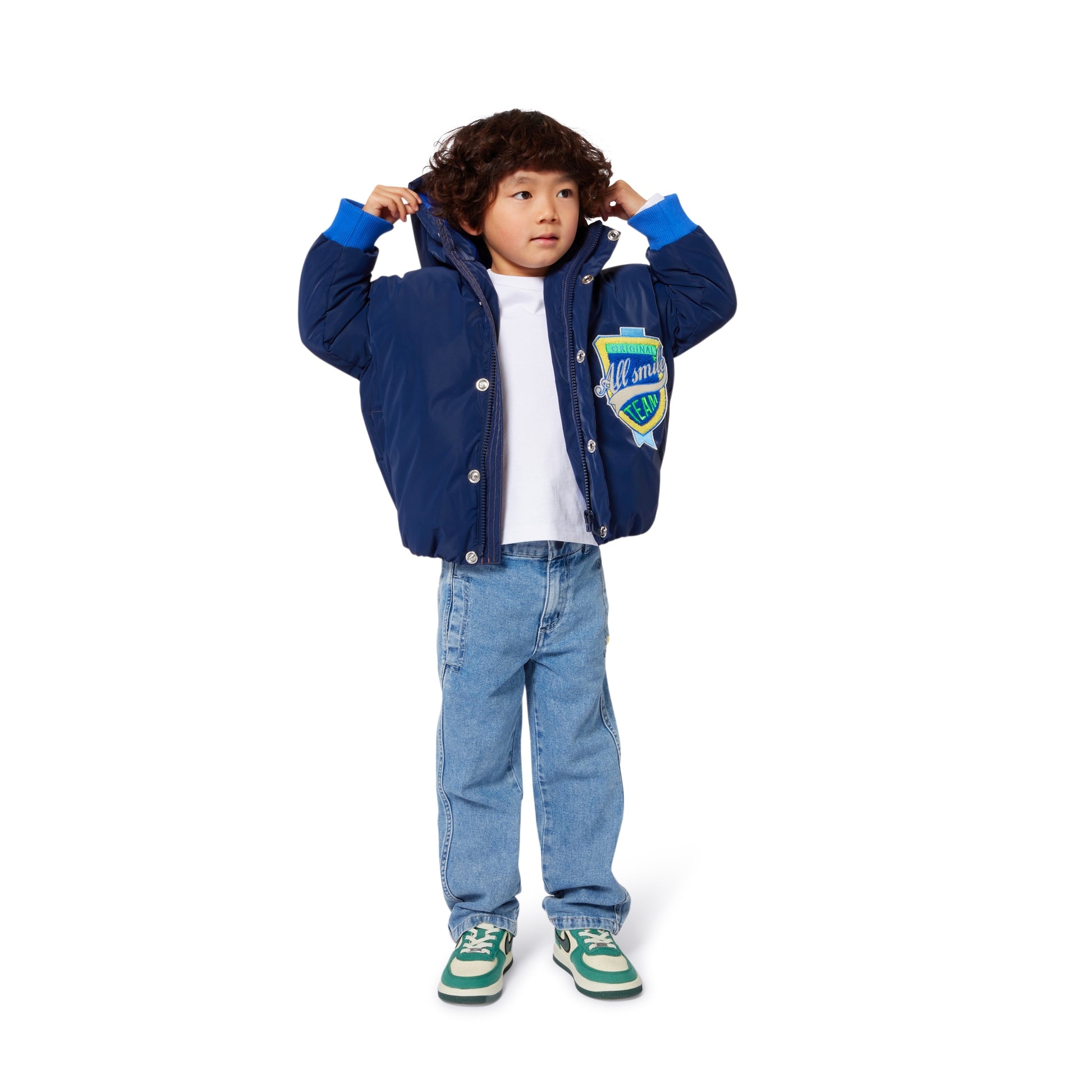 Washed blue jeans for boys by Billieblush, made in soft non-stretch denim with a regular fit. Elasticated around the back for comfort, they fasten with a zip and popper. The style is complete with seam pockets on the front and patch pockets on the back, one trimmed with an 'Okay' bouclé patch.