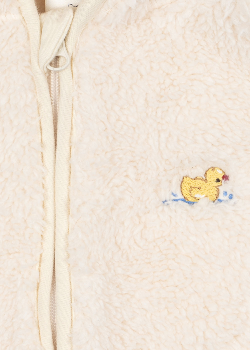 Soft and fluffy onesie that is perfect for keeping little ones warm during nap time. Designed with a soft hood with little bear ears on top, a full zipper closure in front, and a convenient fold-up feature for hands and feet.