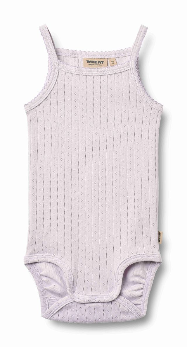 Sleeveless body with thin straps in soft organic cotton pointelle for babies.