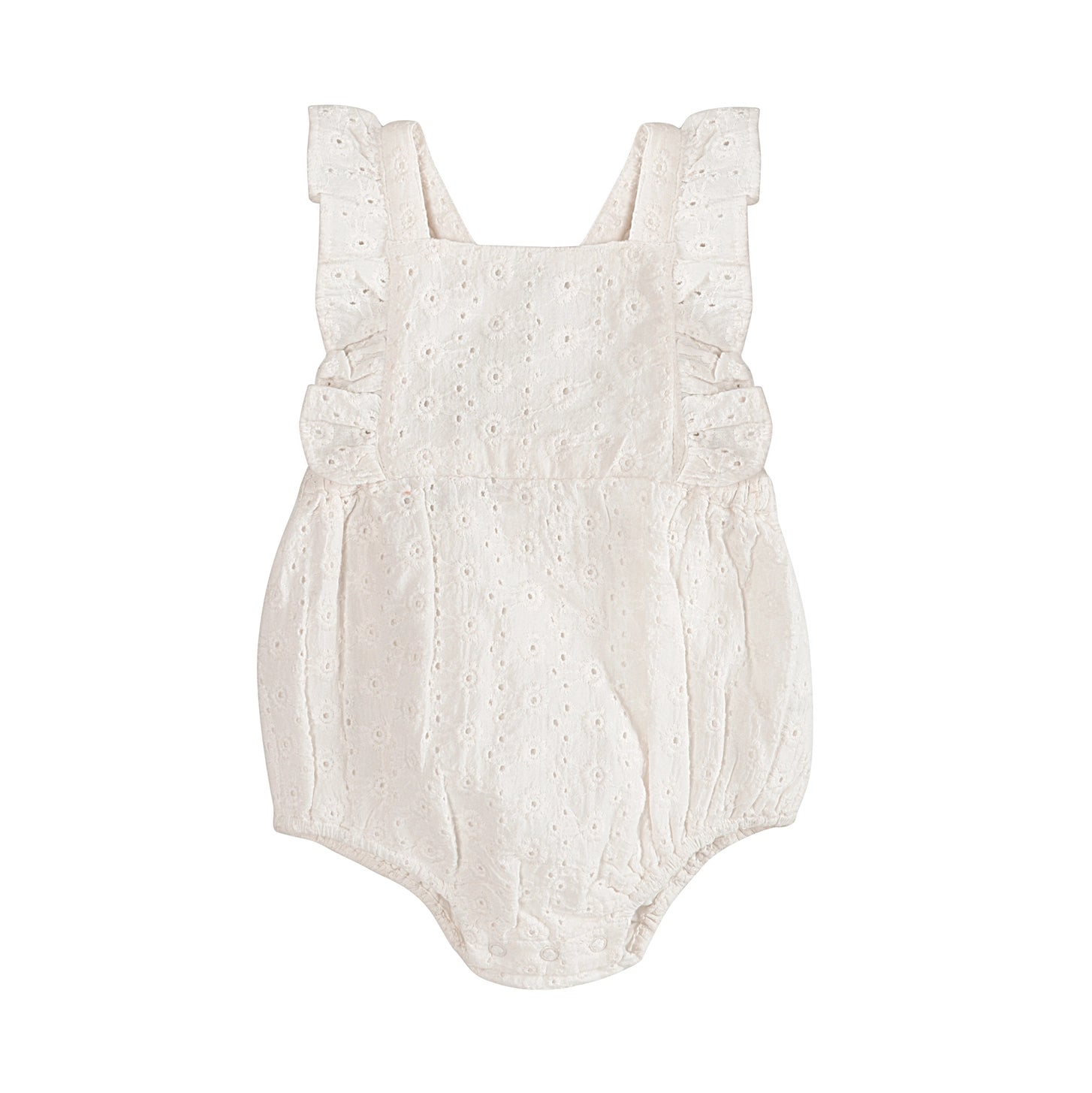 - All-season, super soft, breathable organic cotton Schiffli baby romper and headband set, comfy and cozy.