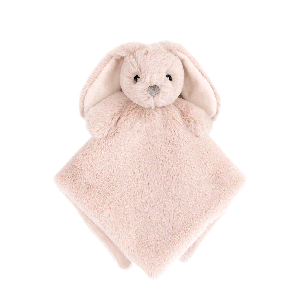 features a pink bunny with velvety velour-lined ears and an expertly embroidered face, perfect for babies to cuddle and self-soothe. Its blanket-style body adds extra softness, making it ideal for snuggling. Perfect for baby showers and gifts, you can also pair it with our matching rattle for a delightful set that both mom and baby will adore!