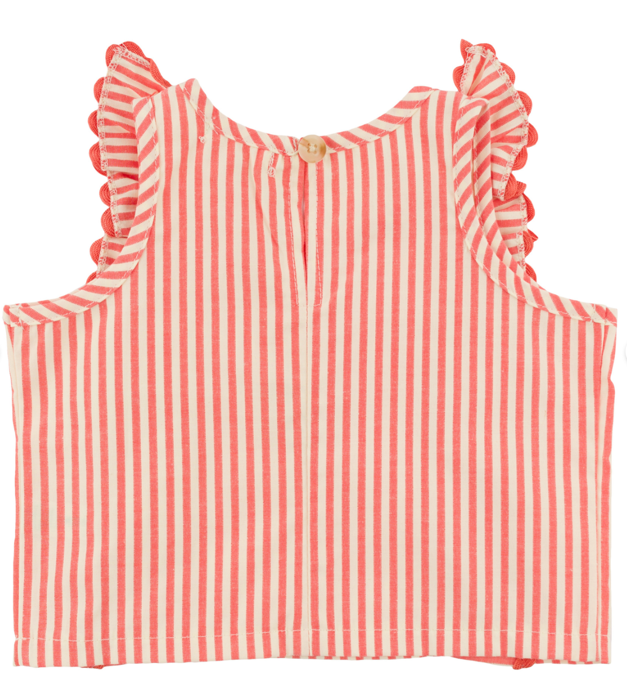 Oh Baby toddler girls striped ruffle sleeveless top, with a convenient button back closure. Available in infant, toddler and girls sizes. Designed in Minnesota.