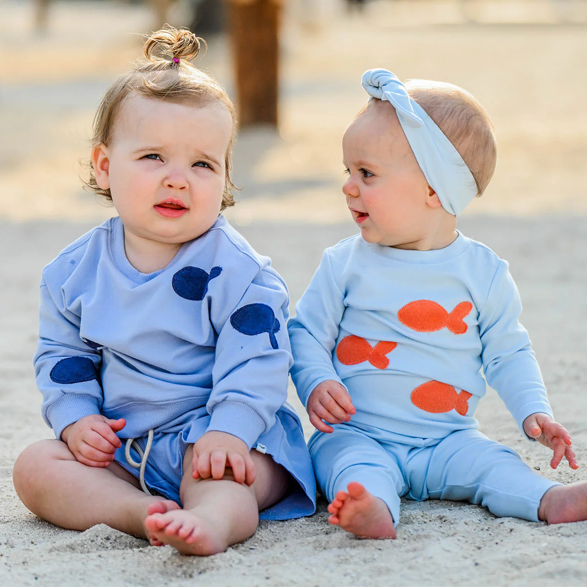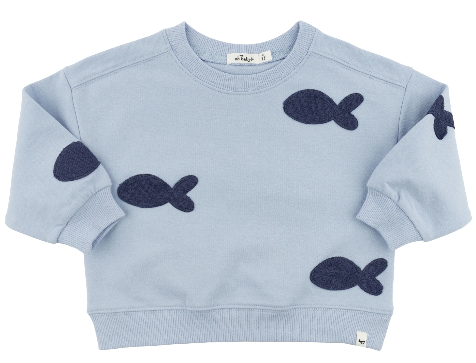 Introducing the oh baby! Charlie Sweatshirt, perfect for your little fish in the family! This playful summer sweatshirt features a fun all-over navy fish appliques design. It's made with comfortable cotton for all their boating or beach adventures. Available in infant, toddler and boys sizes. Designed in Minnesota.