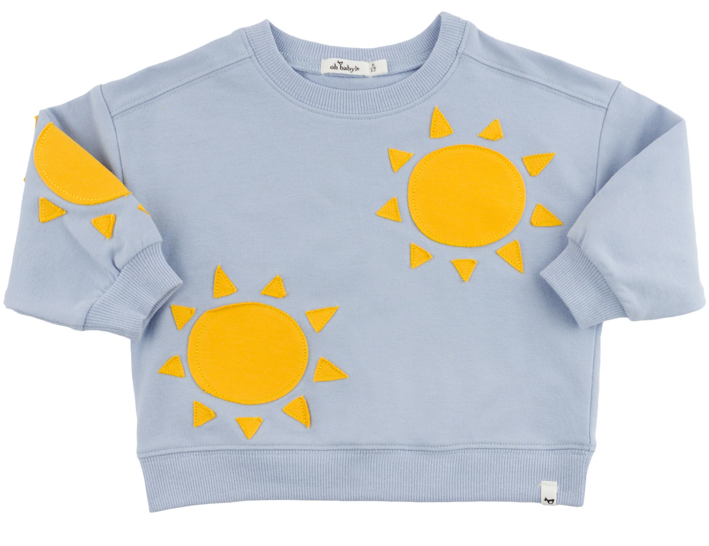 Add some sunshine to your little one's wardrobe with the Charlie Sweatshirt. This playful crew sweatshirt features all over bright golden sun appliques, perfect for brightening up any outfit. Made with soft cotton, it's ideal for little boys on the go. Available in infant, toddler and girls sizes. Designed in Minnesota.