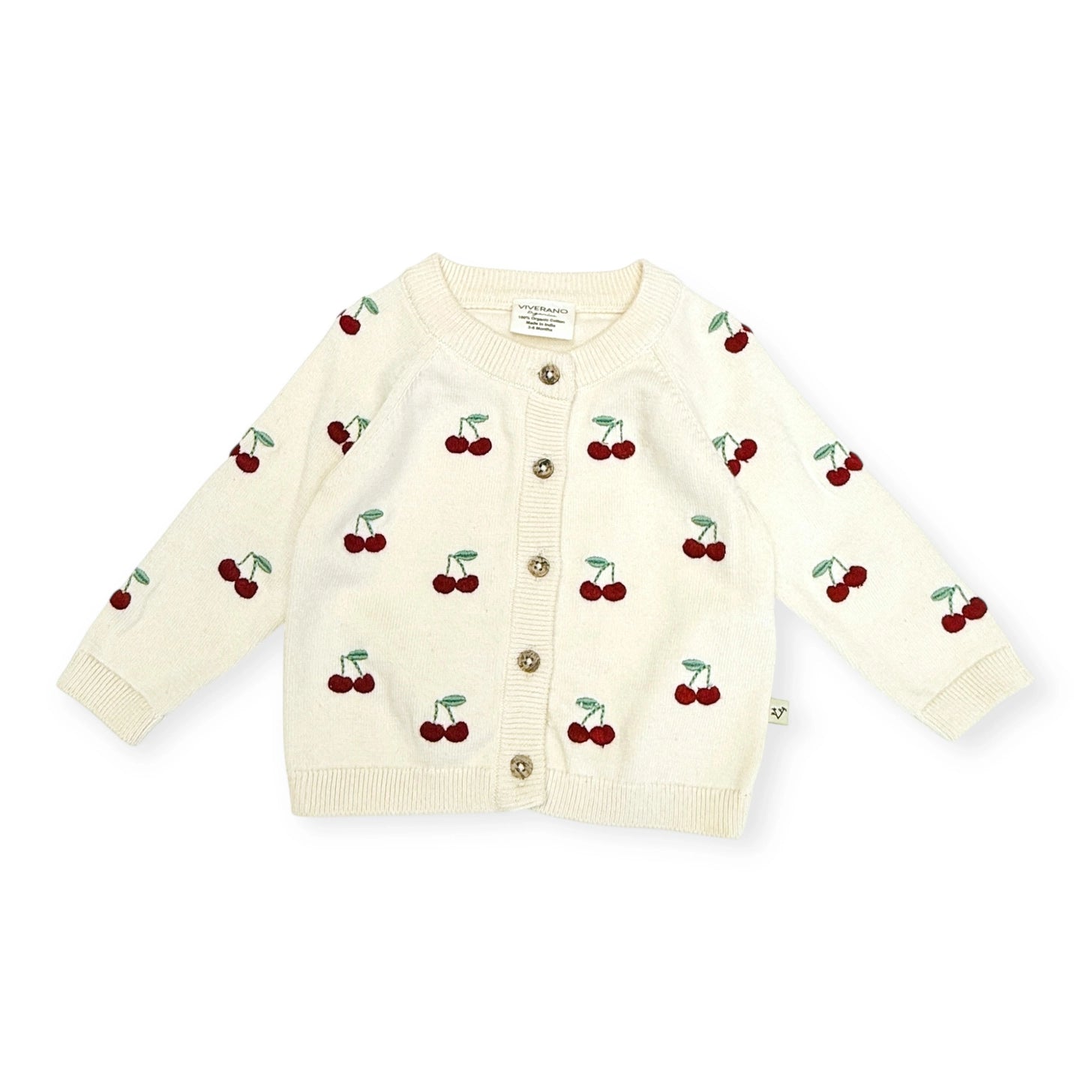 Sweet and timeless, this baby sweater knit cardigan features scattered cherry stem embroidery across the front and sleeves on a soft cream base. Made from breathable organic cotton, it’s finished with a button-down front for easy layering and everyday charm.