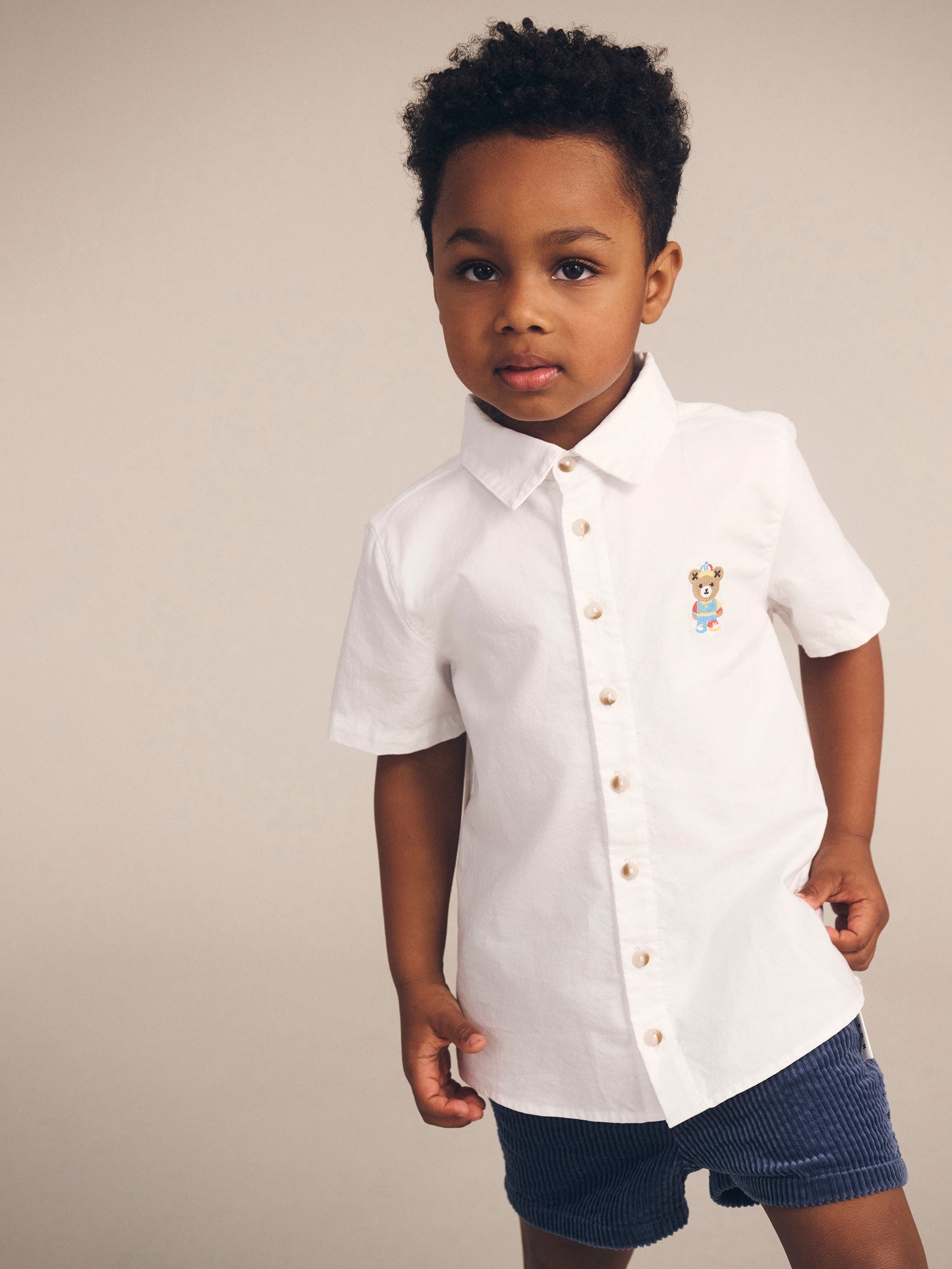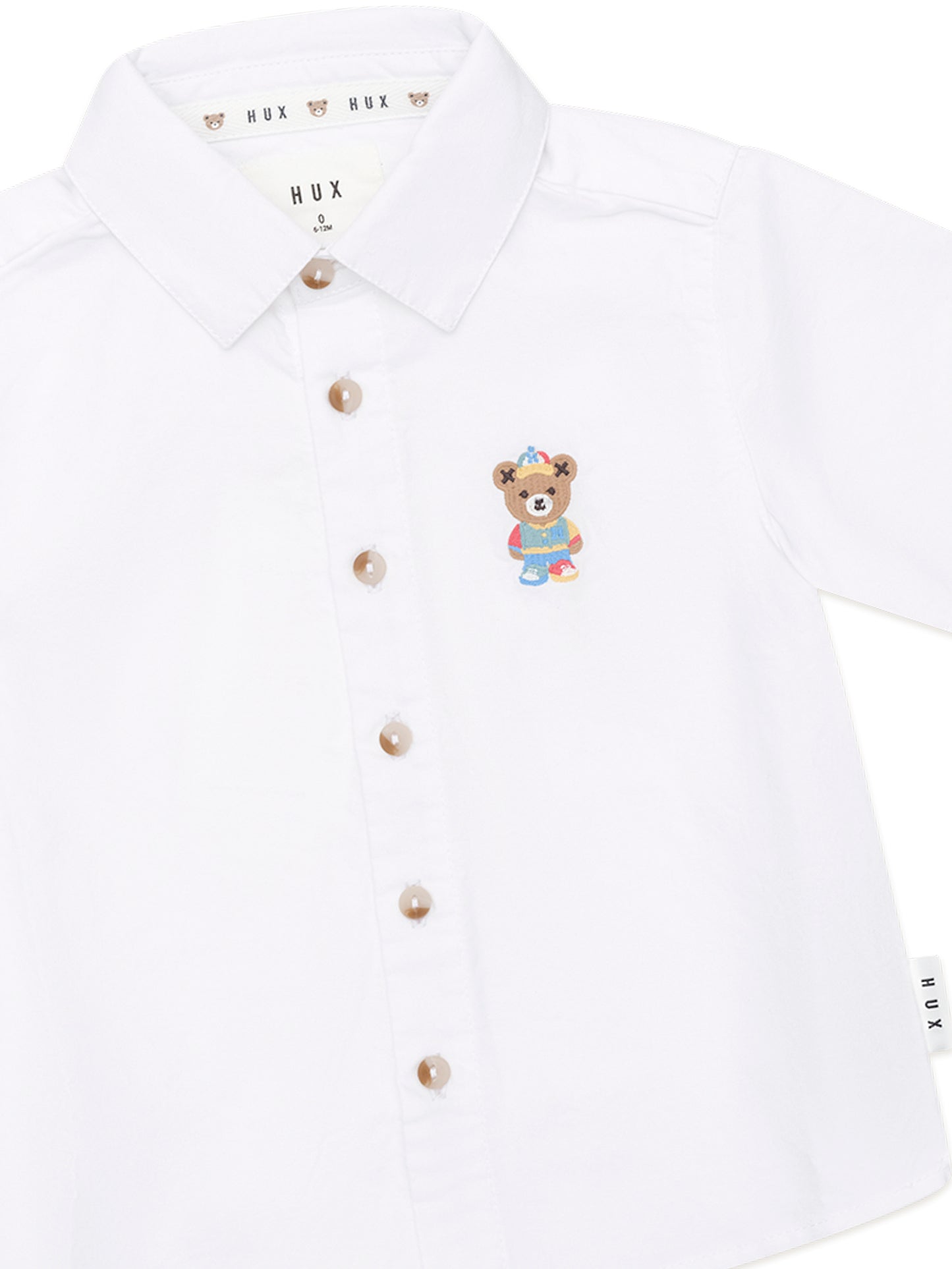 The perfect short sleeve button down shirt. In a classic crisp white hue made from beautiful cotton with a relaxed casual fit and point collar. A timeless style, featuring a cute Huxbear embroidery on the left chest.