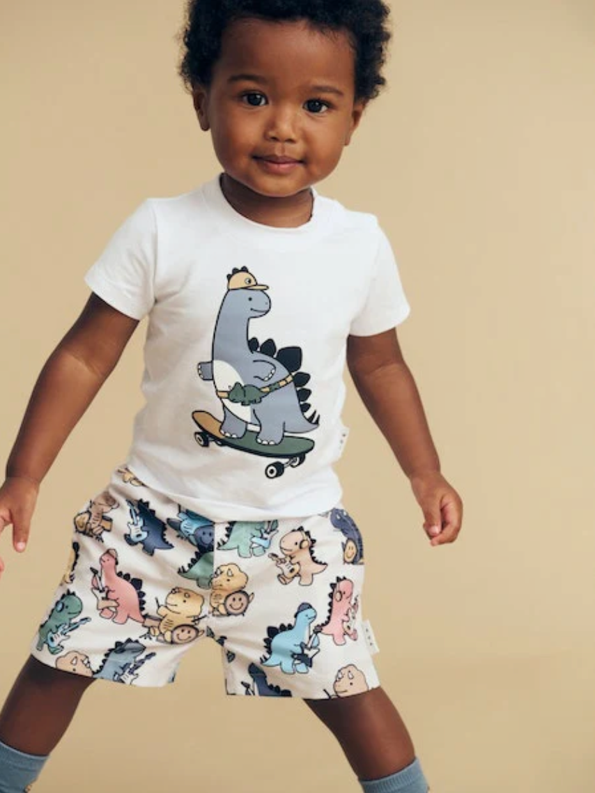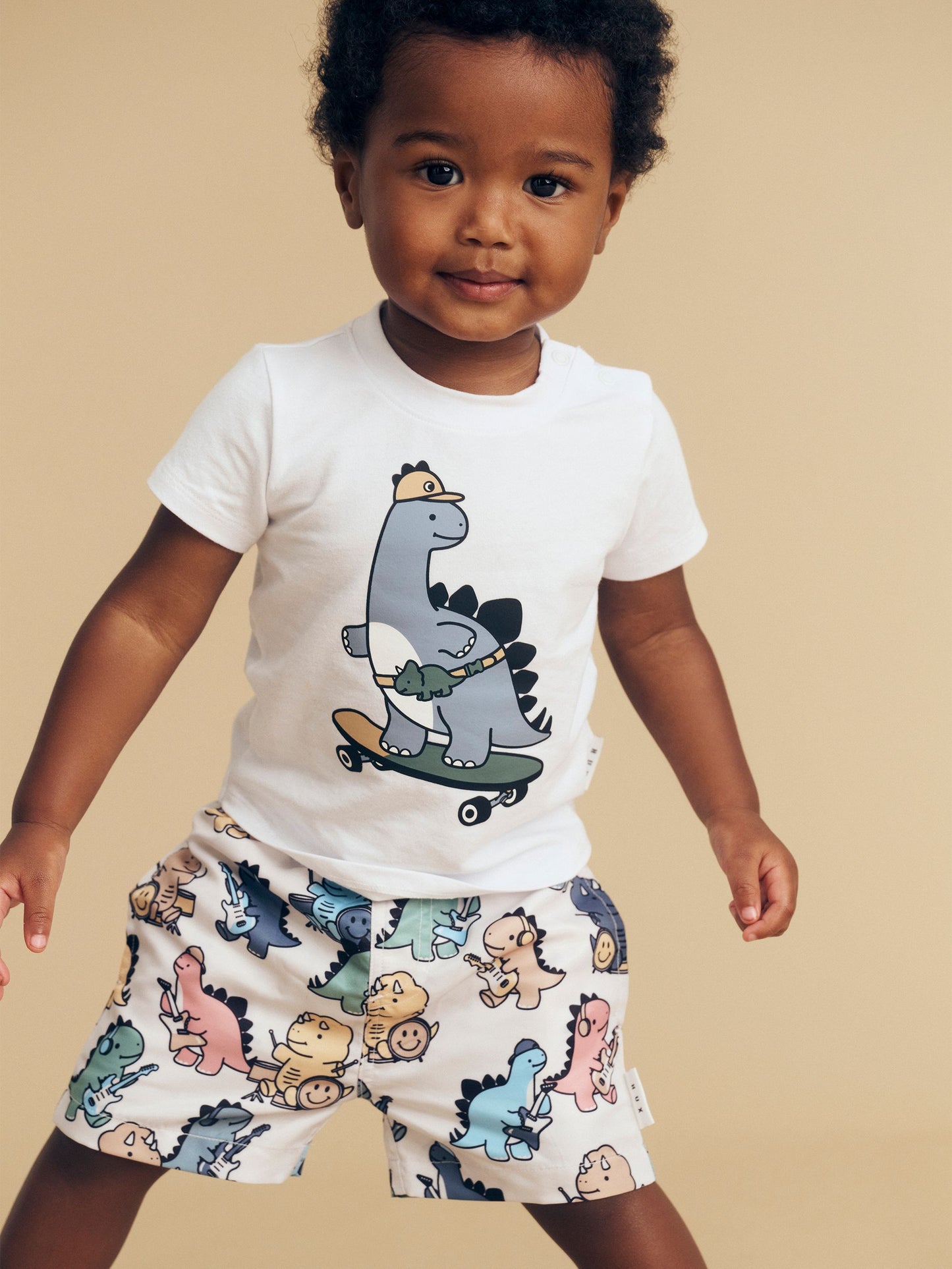 Swim shorts with all over dino band print, side pockets and adjustable drawstring