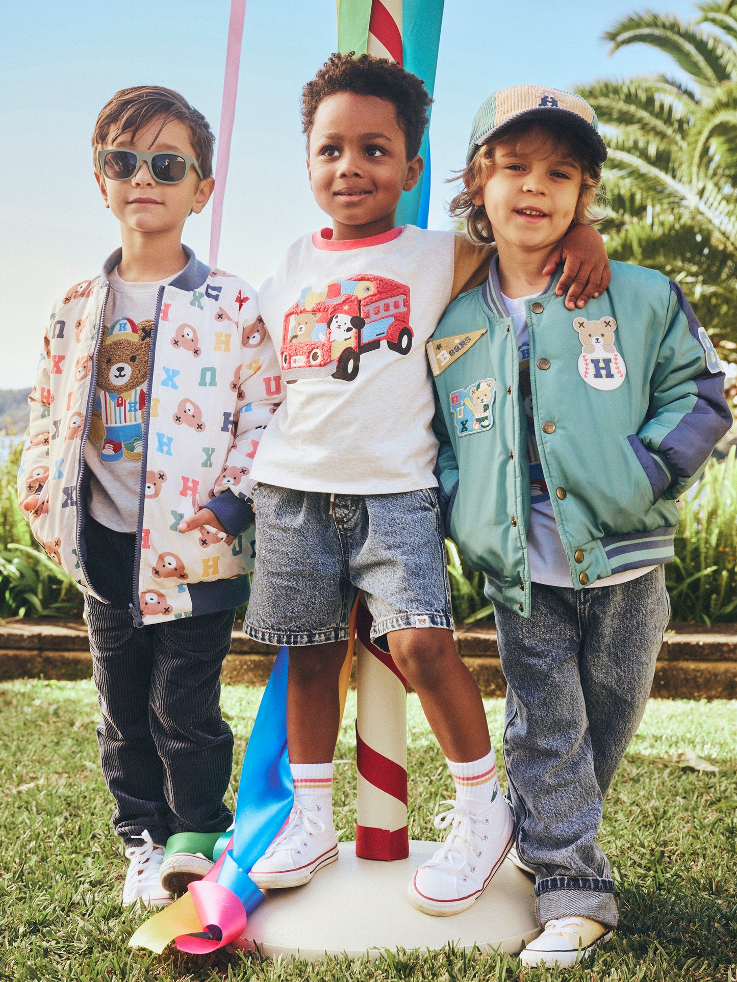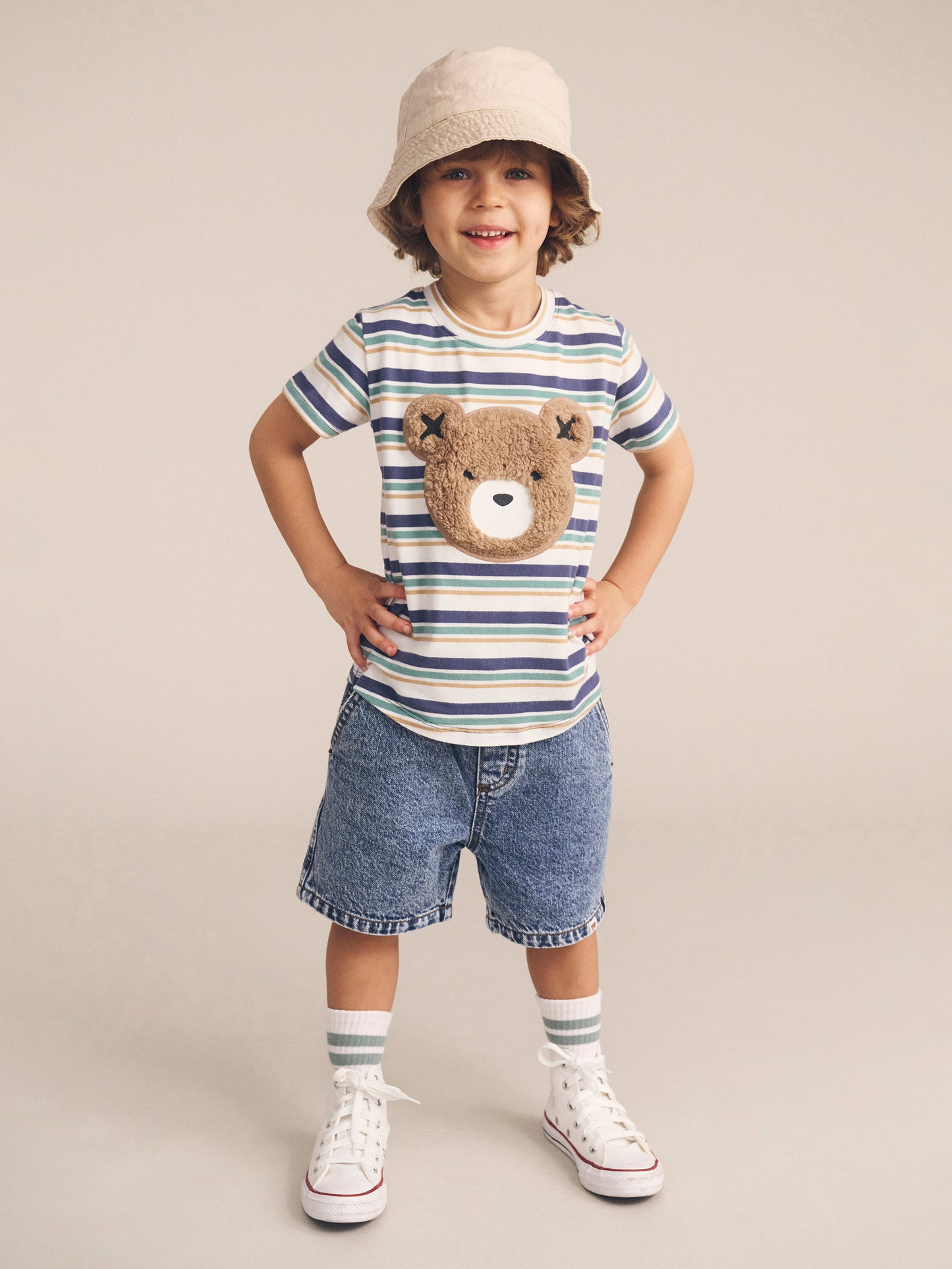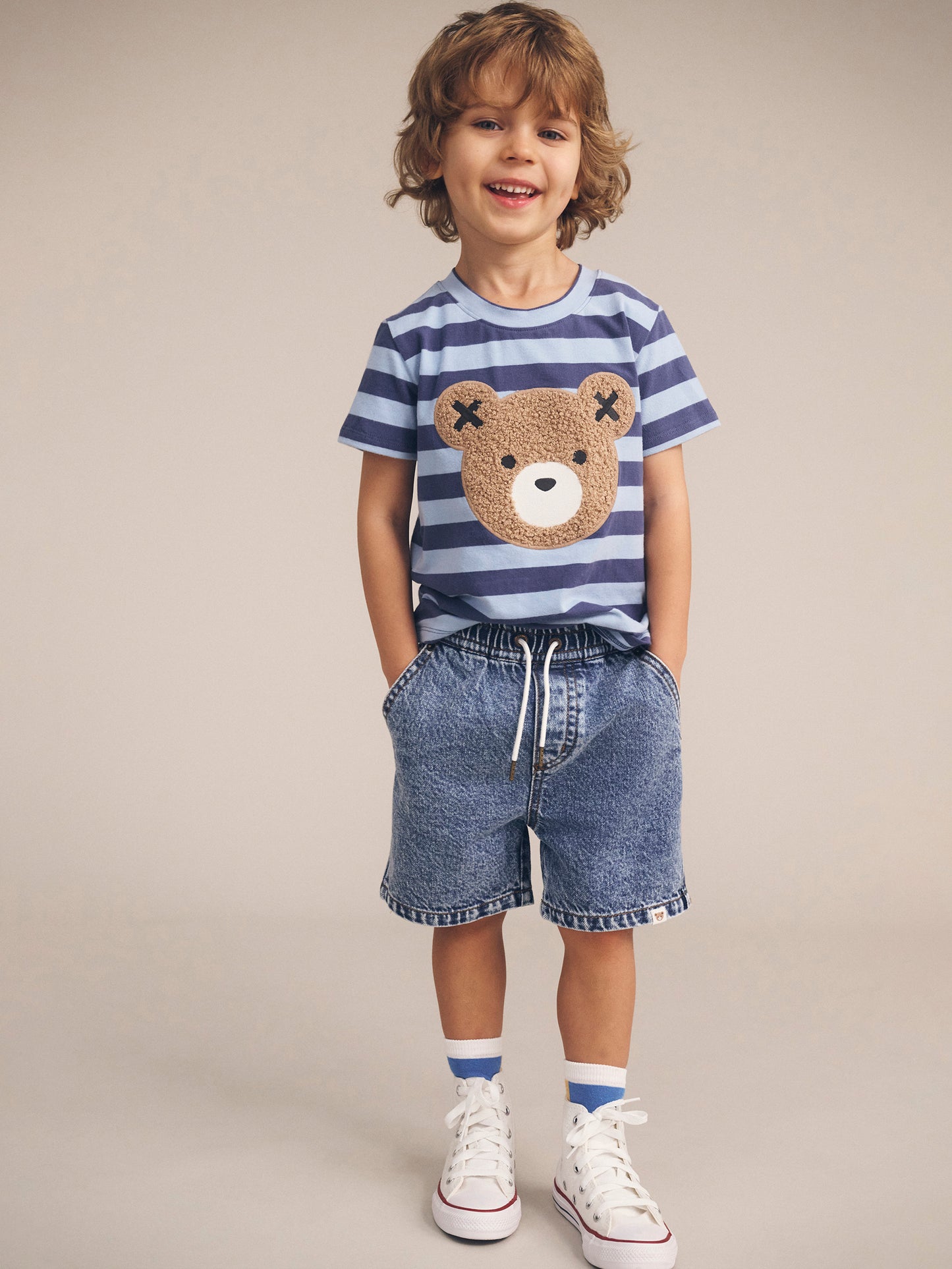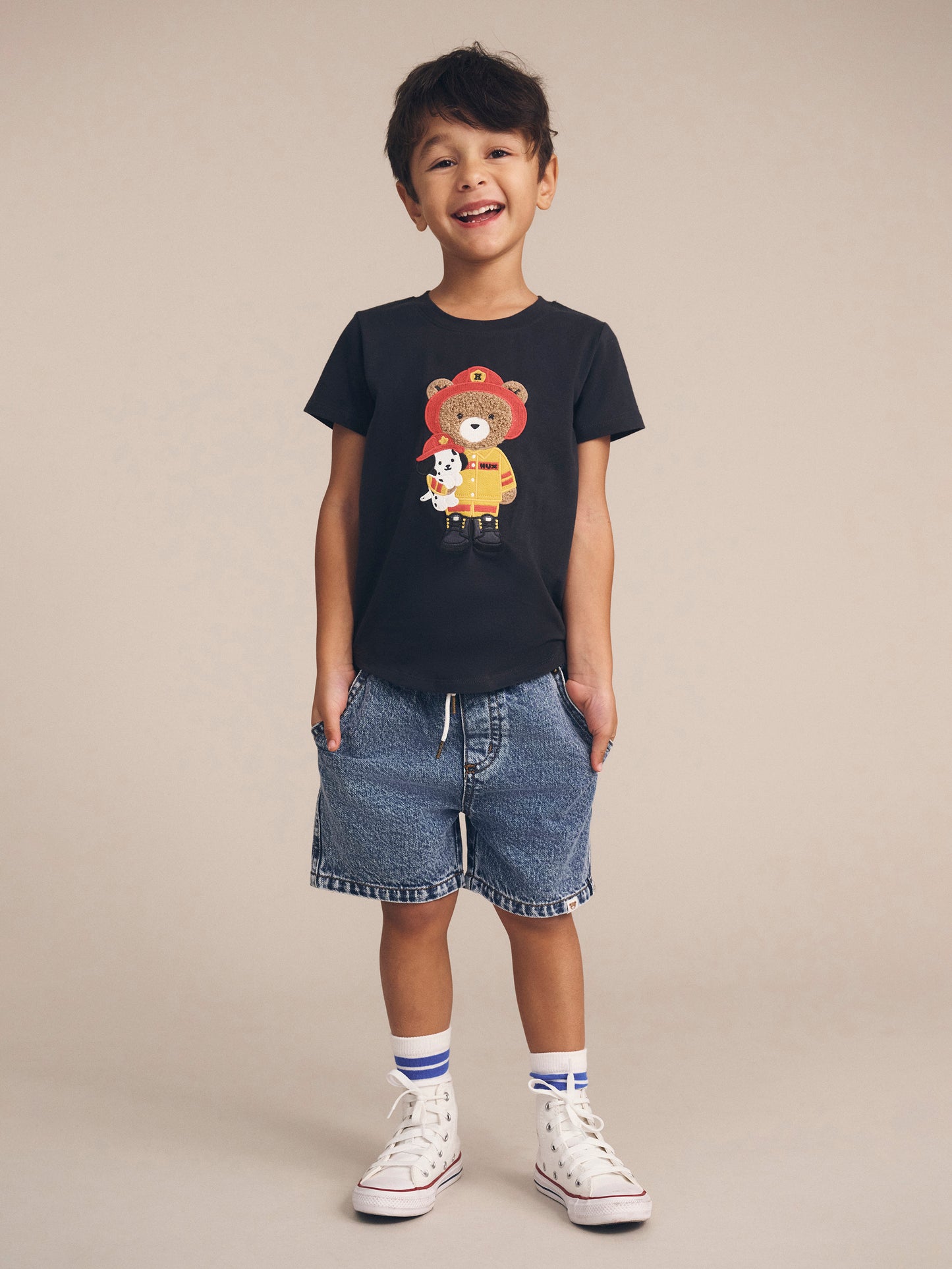 No other shorts compare. Made from the softest denim you’ll ever feel, they feature a kid-friendly elasticated waistband and adjustable drawstring. Front and back pockets hide treasures perfectly, and an oversized, relaxed cut looks cool on every occasion. Spot the Spot the Huxbear patch on the bum as they run away to play.