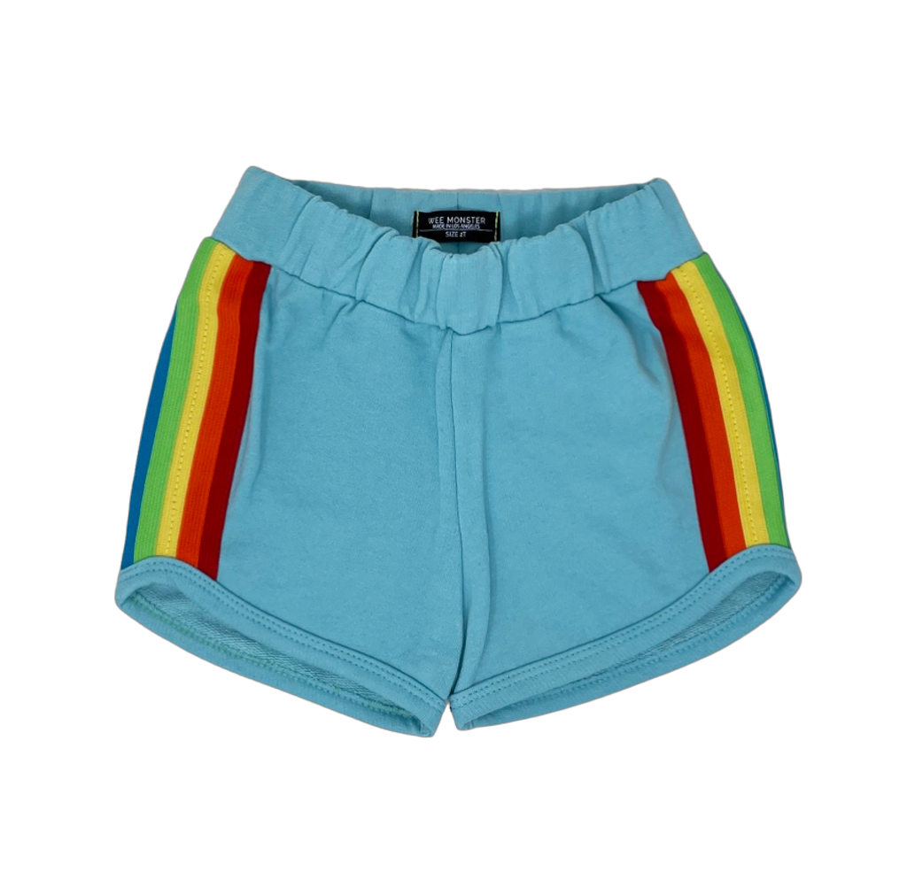Rock these funky short shorts for girls - they've got a groovy blue hue and rainbow graphics on the sides!