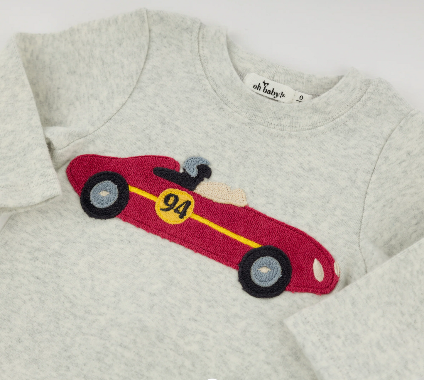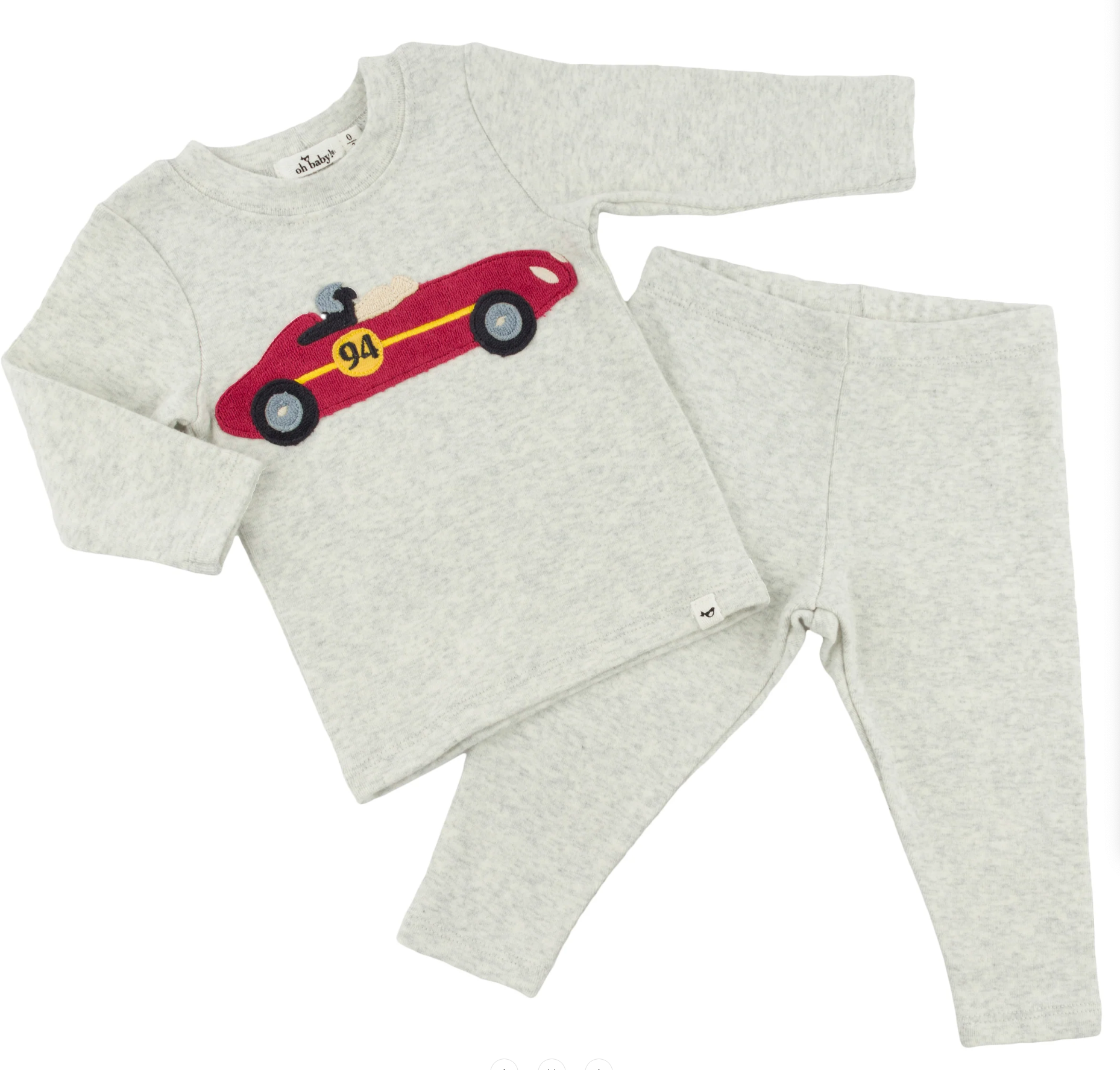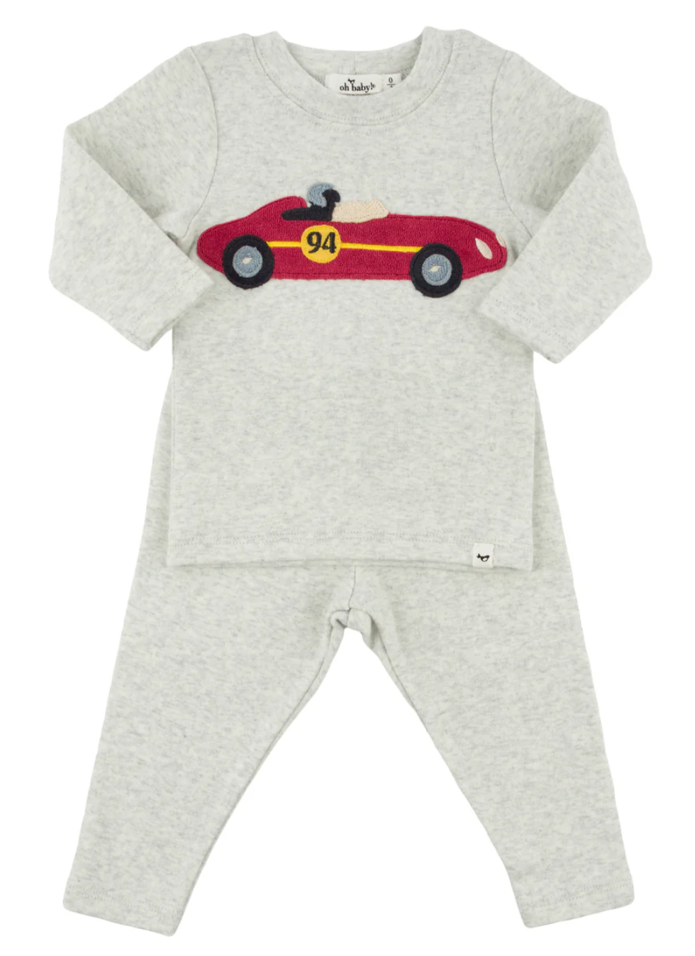 Rev up your little one's style with our oh baby! Two Piece Set. This outfit is sure to score big with its sporty and playful red race car applique. Get ready for some speed and fun with this sports-themed set. Available in infant sizes. Designed in Minnesota.