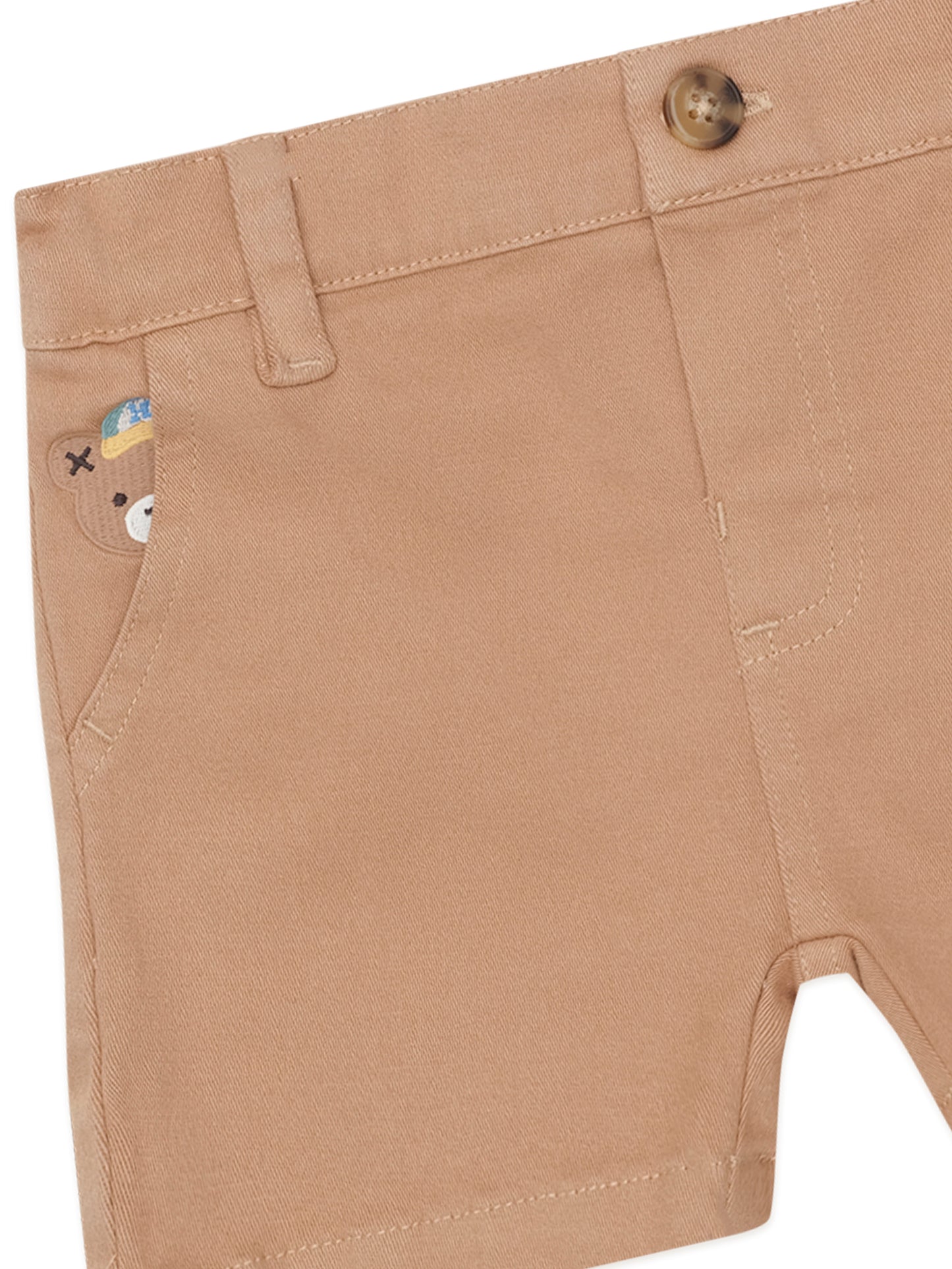 The perfect chino short for warm weather occasions. Dress them up or down. Made from a velvety soft, brushed cotton twill, they feature a peeping Huxbear embroidery on the pocket and an internal button waistband and belt loops for adjustable wear. Zipper fly on sizes 4 and up.