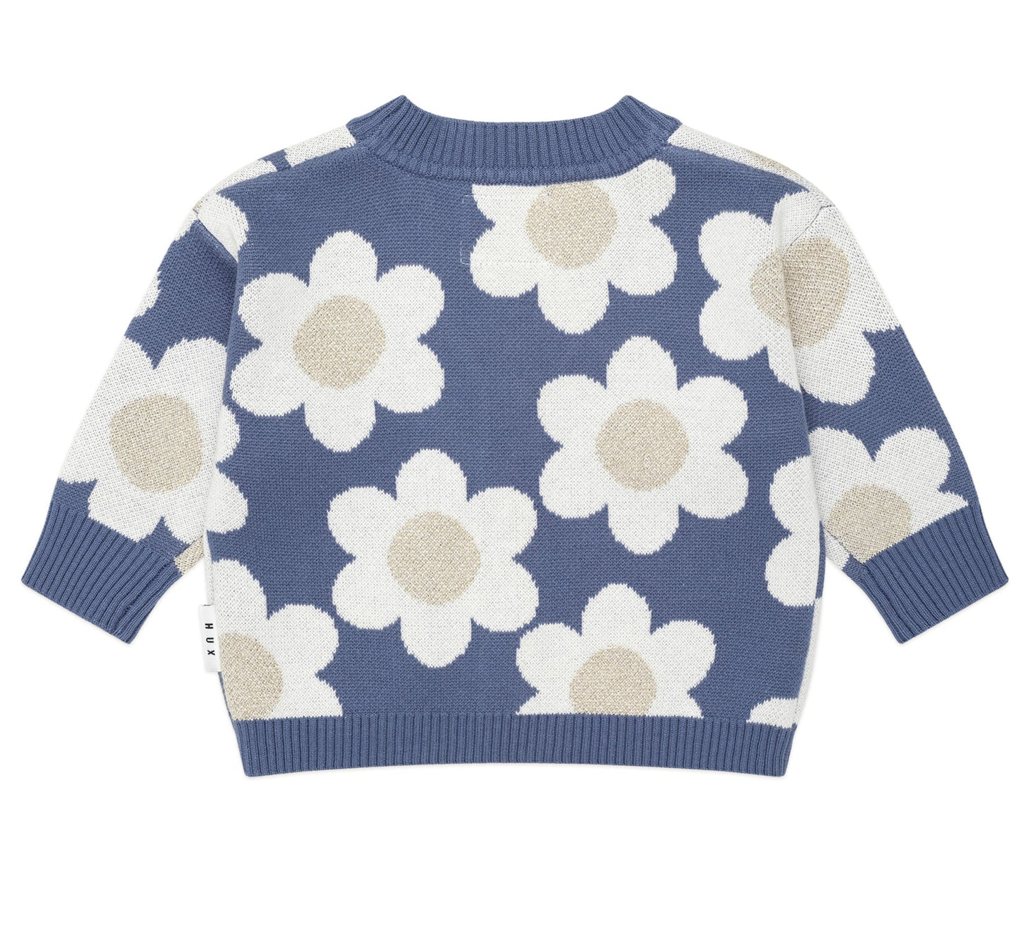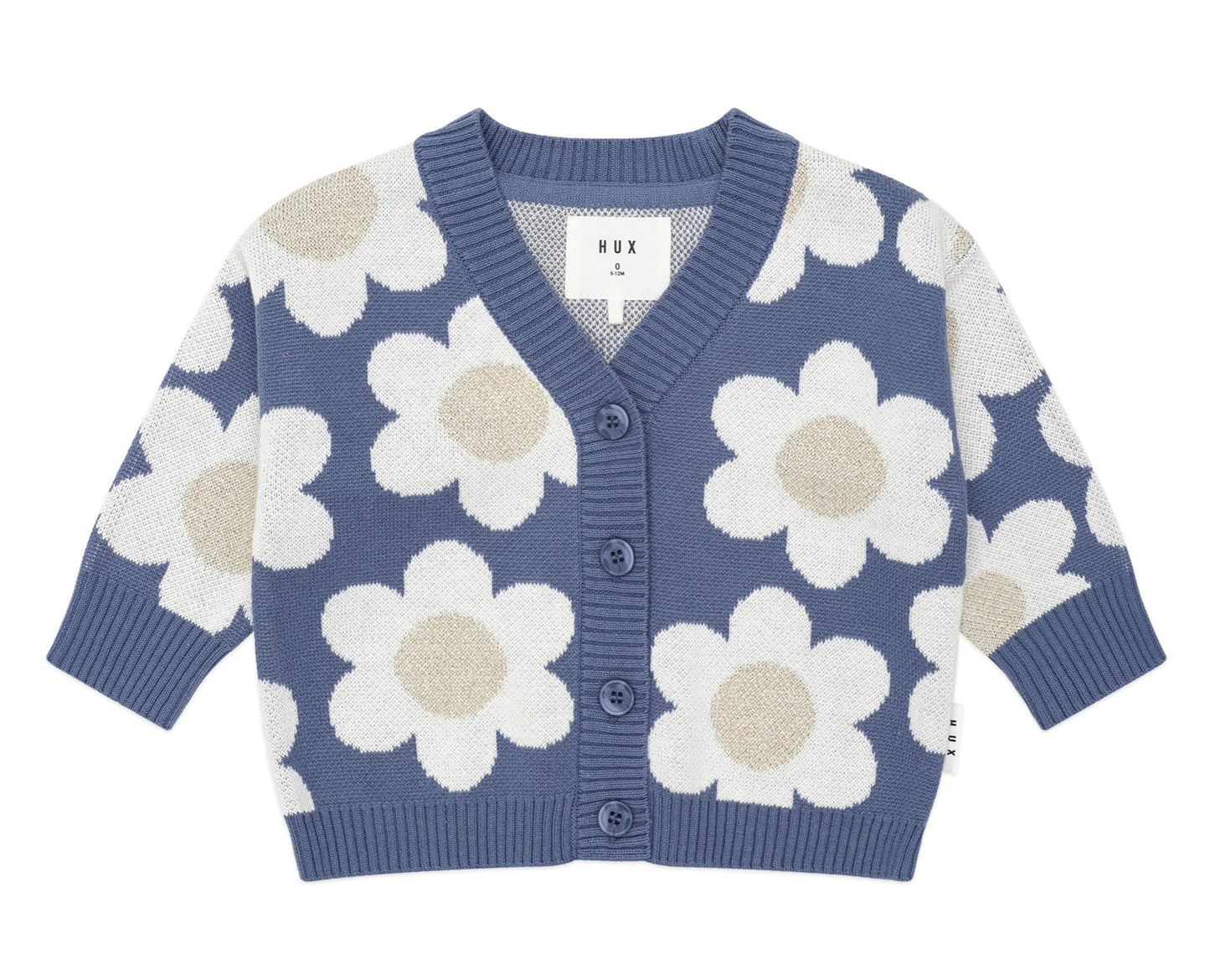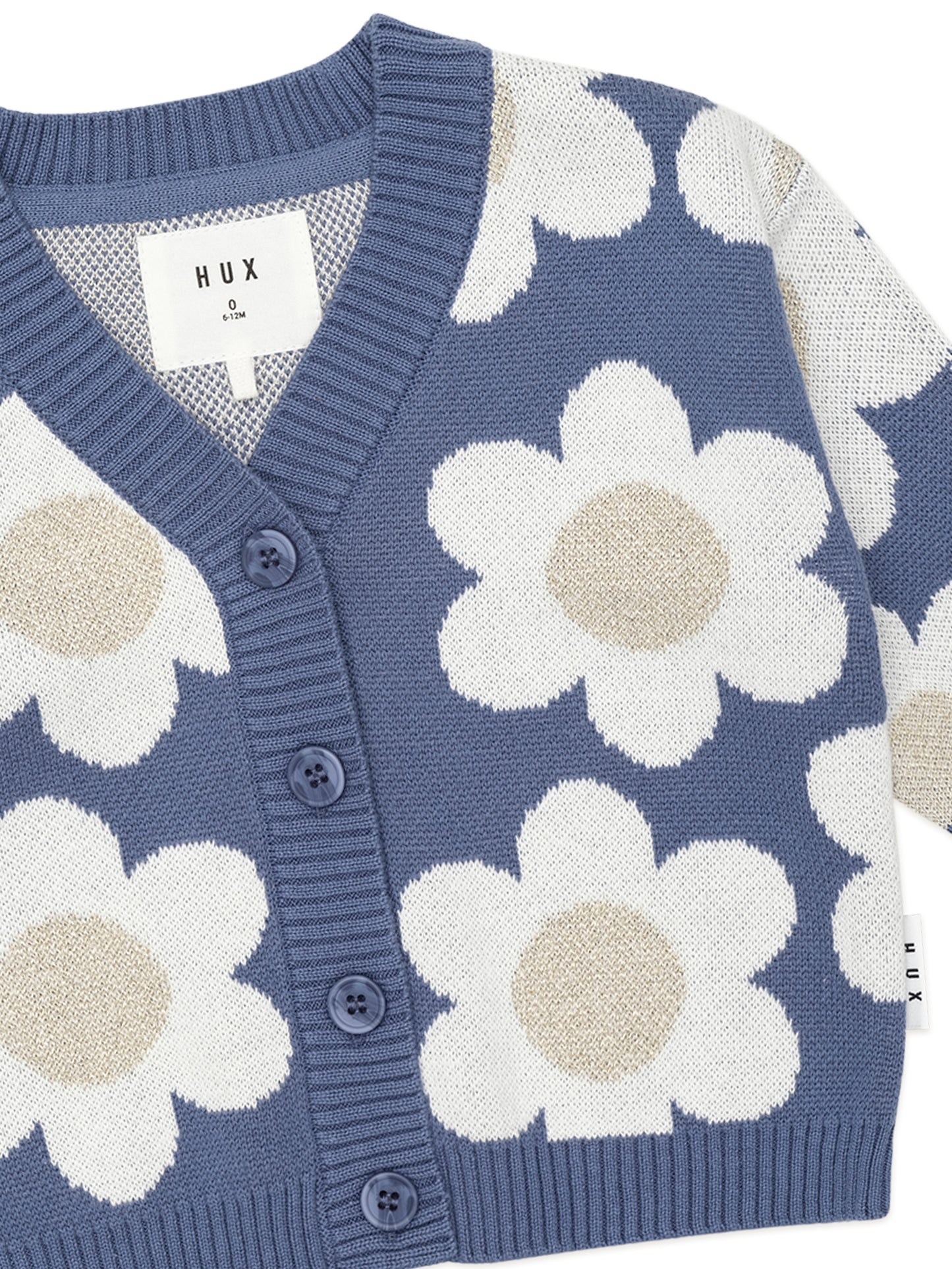 If the playground is a catwalk, this boxy fit cardi in midnight blue is the star of the show. Made from luxuriously thick jacquard knit organic cotton, it has an all over daisy pattern in sparkly gold and big buttons for easy layering.