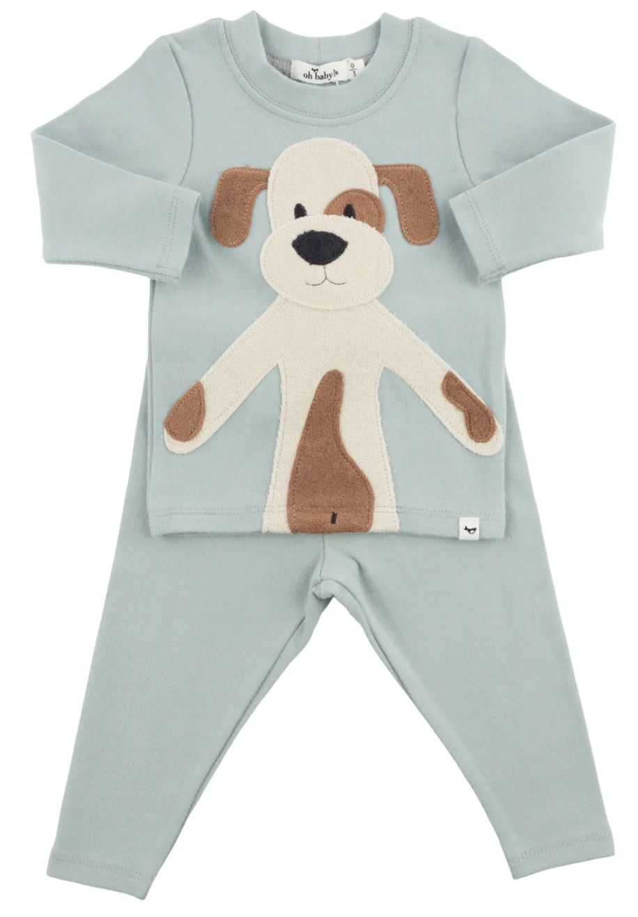 Made with soft cotton, this outfit is perfect for your baby boy. The floppy-eared puppy applique adds a playful touch. Available in infant sizes. Designed in Minnesota.