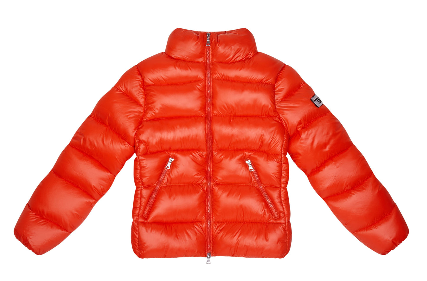 Putney's plant-based downy jacket in fire-y orange, with pocket zippers and a crew-neck puff!