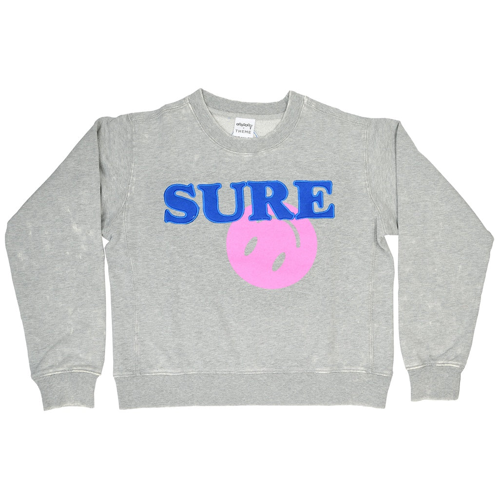 Make a statement with this swanky sweatshirt featuring a positively playful pink smiley face and "Sure" scrawled across the front!