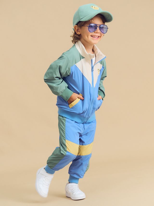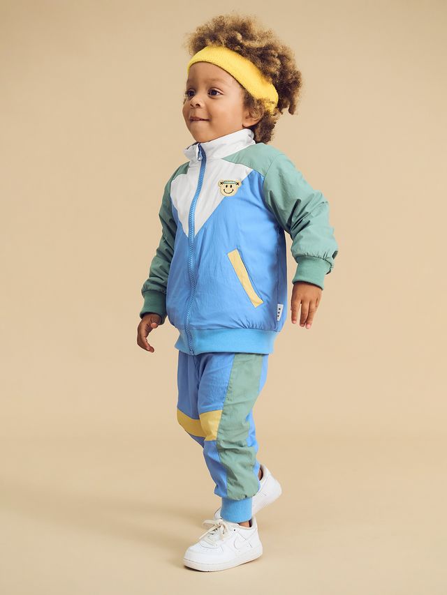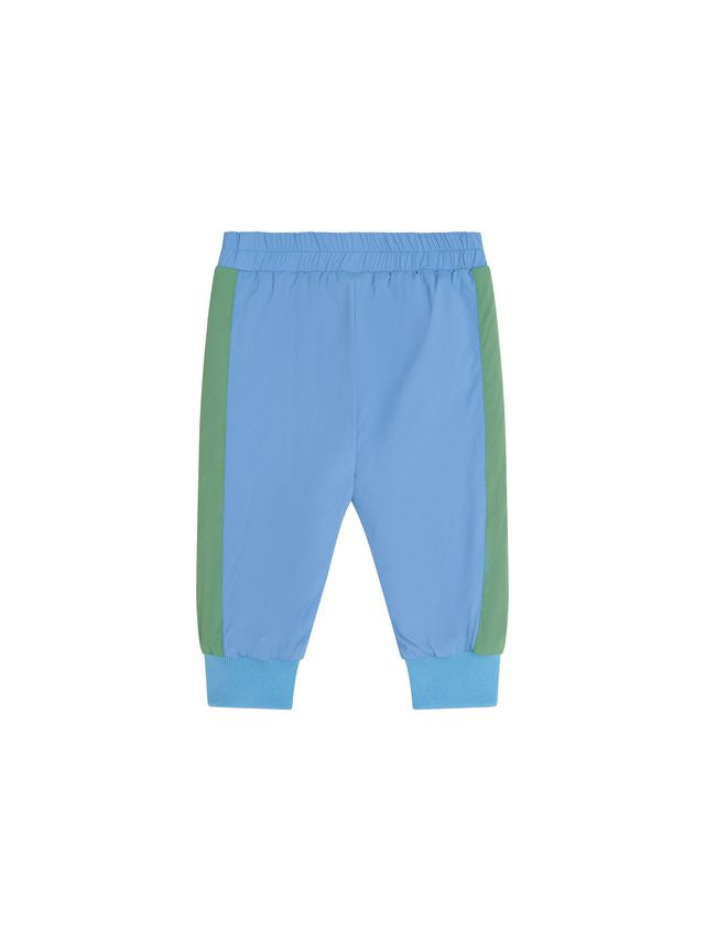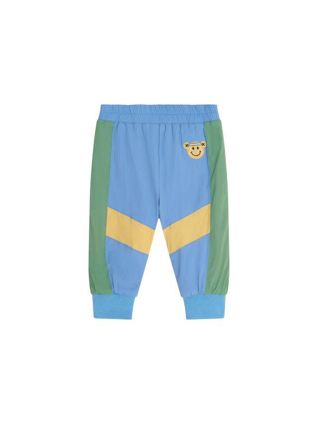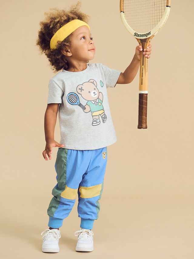 Sporty retro track pant with tennis bear embroidery and spliced panels.