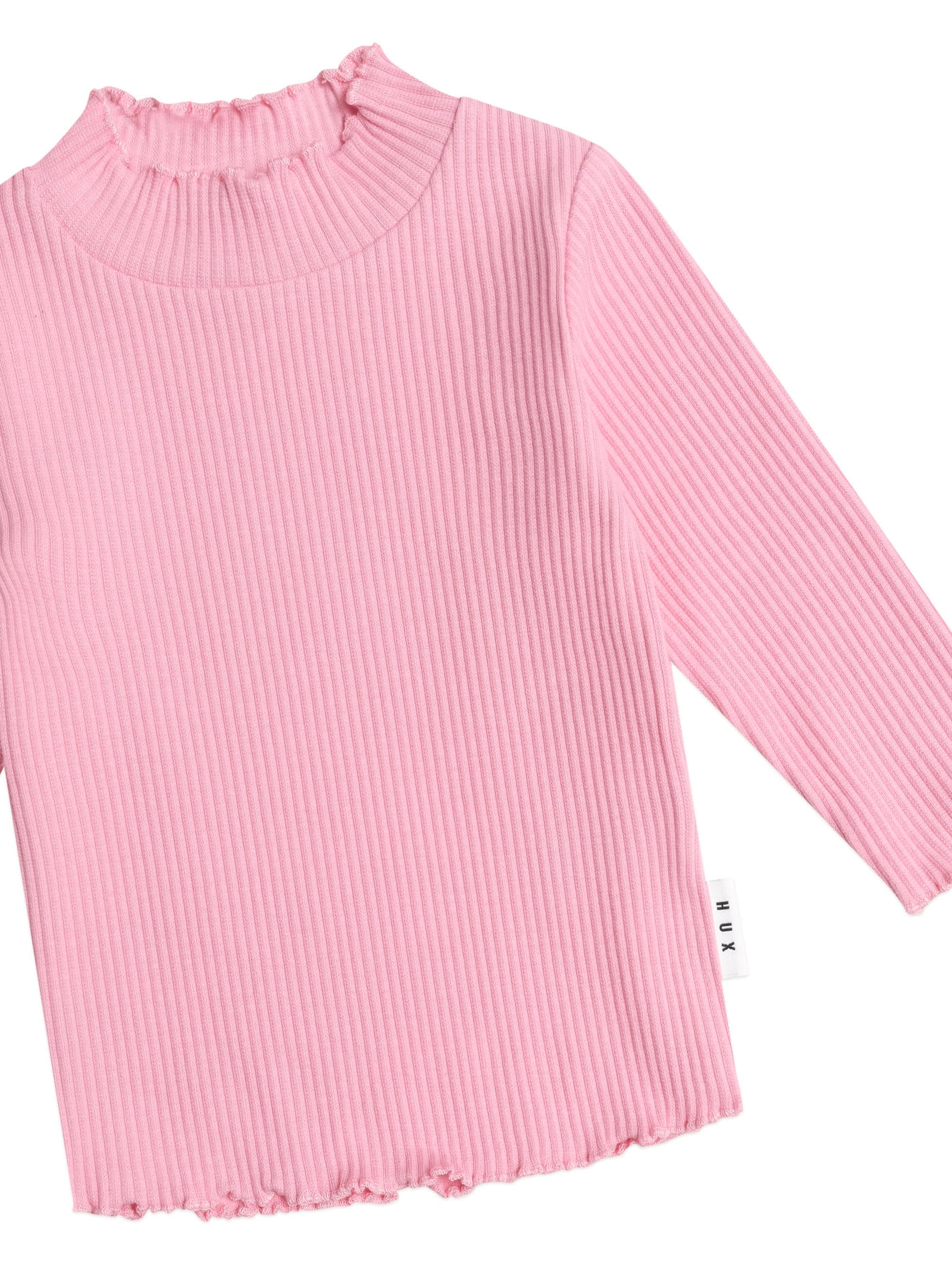 A versatile layering piece in strawberry pink. This long-sleeved top is made from extra thick ribbed cotton to keep little bodies warm and features a sweet lettuce edge detail to complete the look. A true wardrobe essential.