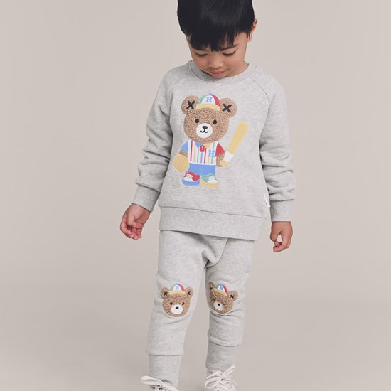 These warm and cosy fleece track pants with a drop crotch are a home run for cool comfort and sporty style. Made from fluffy organic cotton, they feature a functional drawstring for an adjustable fit, a cute-yet-comfy Huxbear embroidery knee detail and a soft, stretchy waistband to keep little tummies snug.