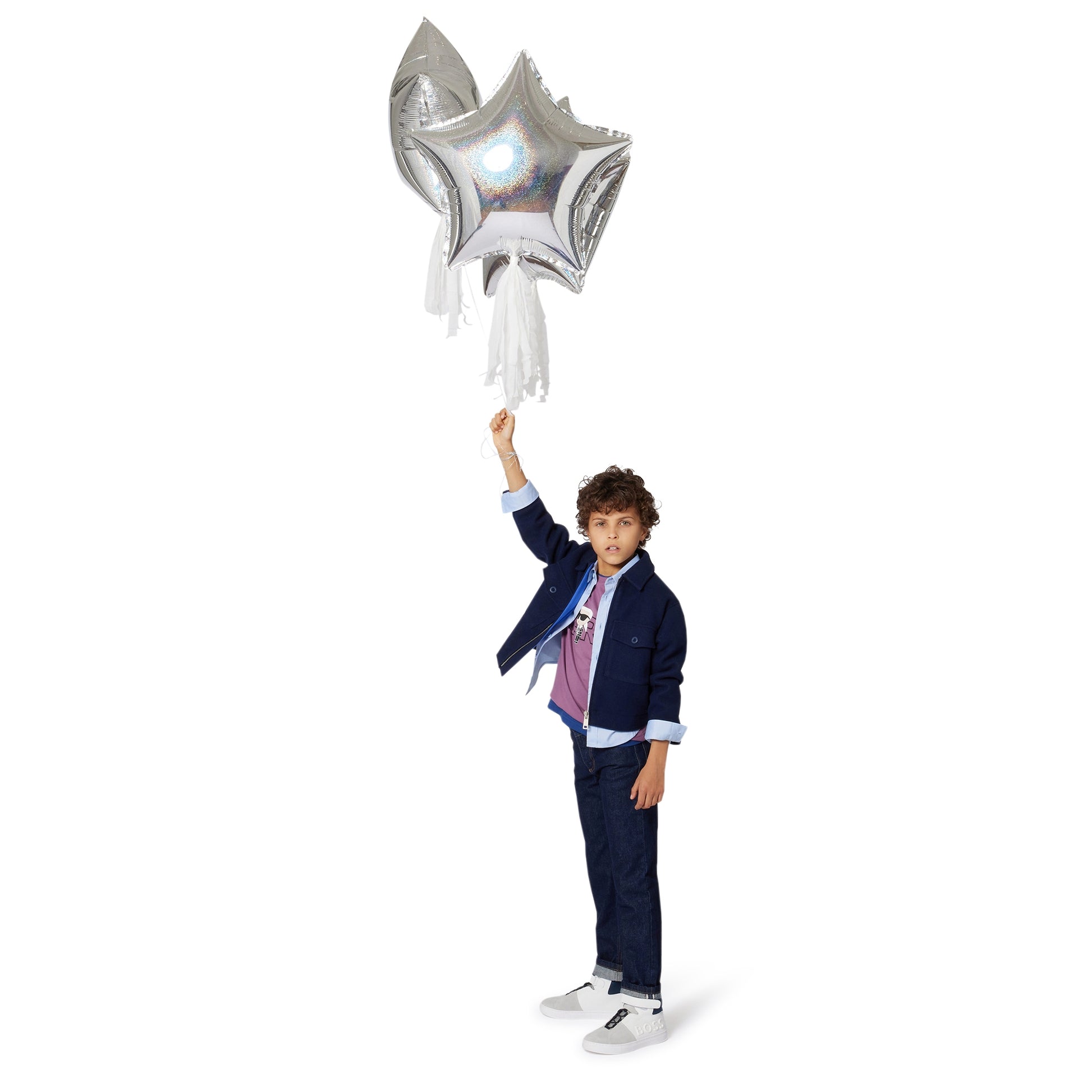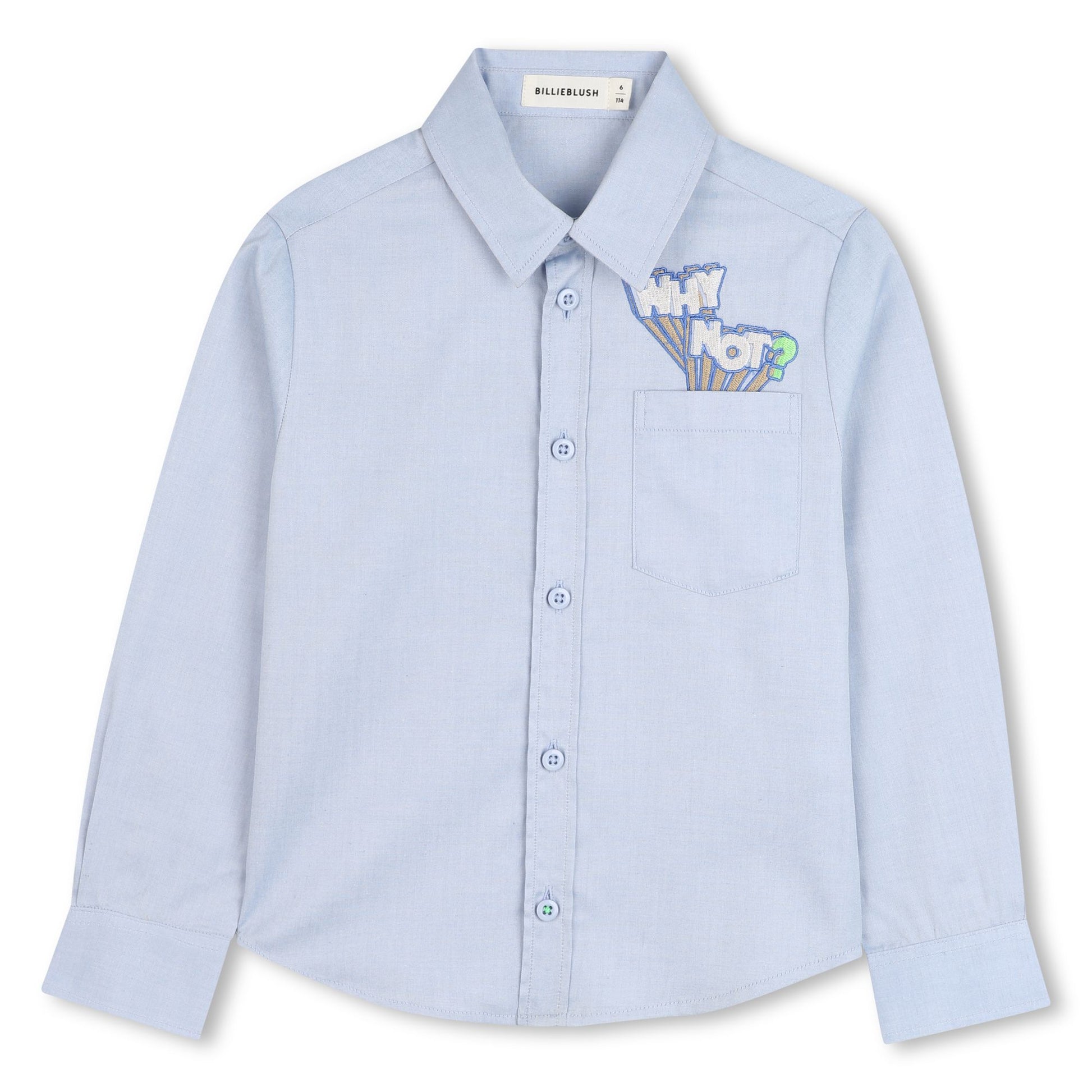 A light blue shirt for boys by Billieblush, woven in smooth Oxford cotton. It has a smart pointed collar and a classic button down front. The chest pocket features an embroidered "Why Not?" slogan popping out the top, adding a touch of fun.