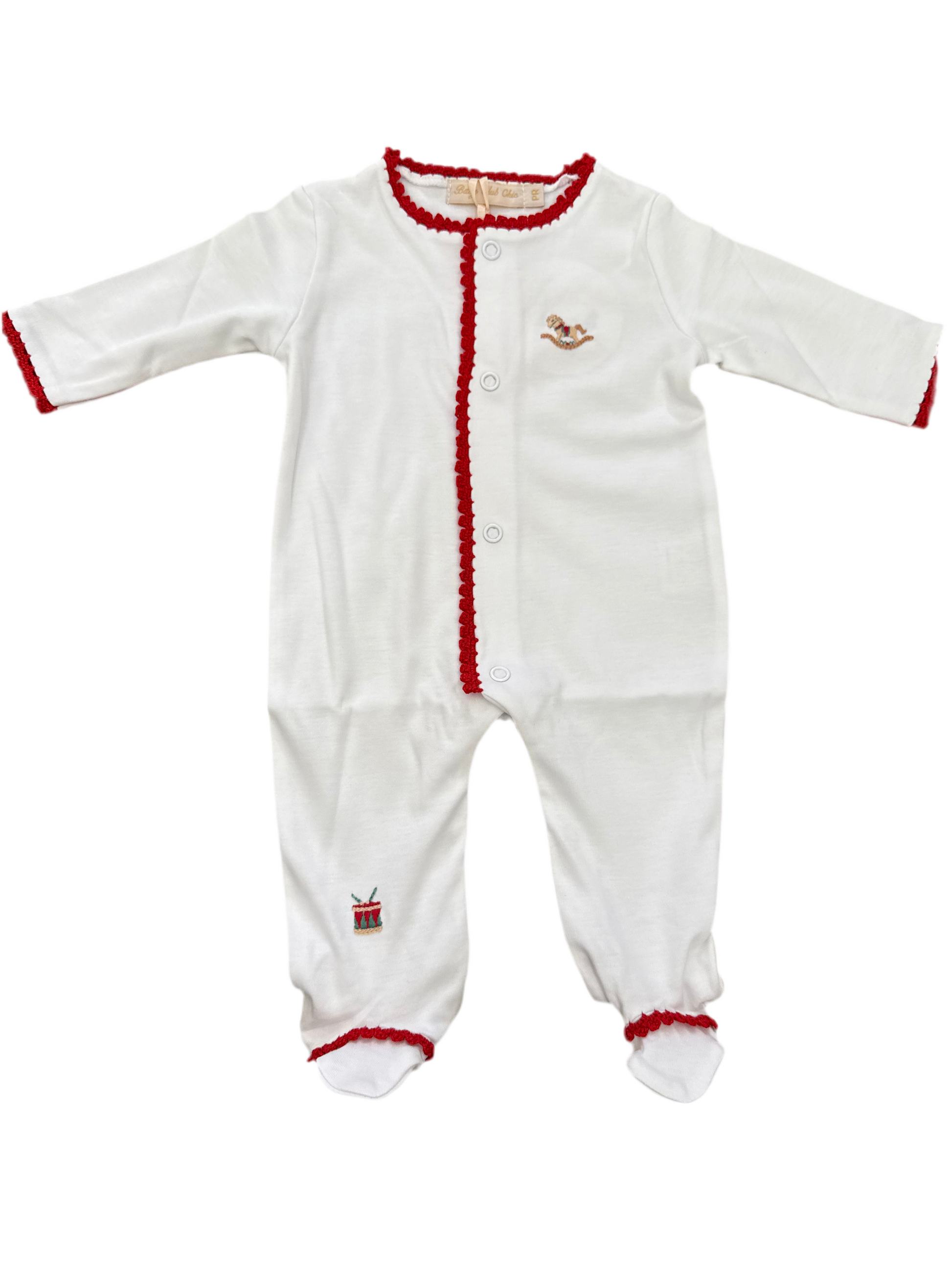 Adorable Christmas-themed footie featuring a fun toy print, perfect for your little bundle of joy