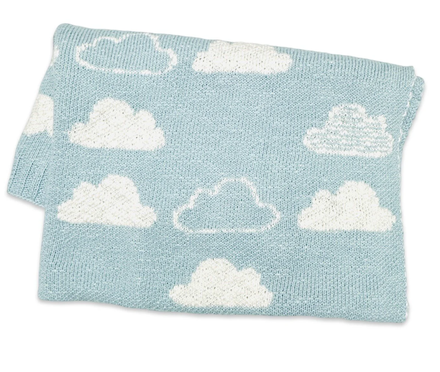 Luxurious 100% organic cotton jacquard baby blanket featuring thick 'n' thin knitting with cloud motif design.