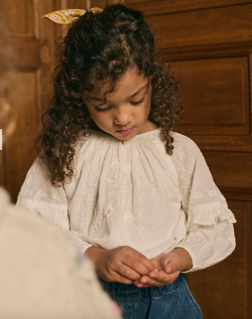 - Puff sleeves with embroidered, ruffled and scalloped detailing, and elasticized cuffs.