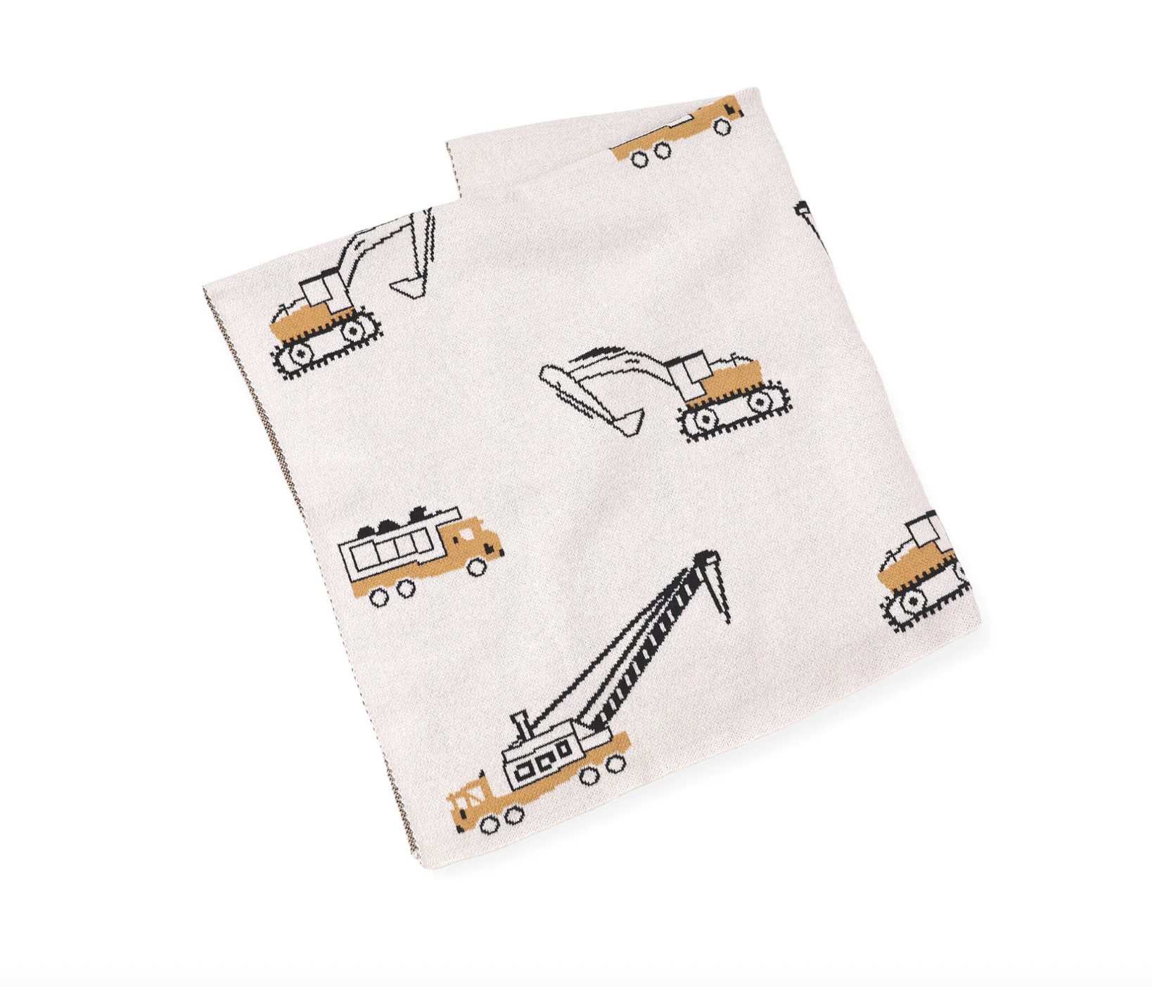 Luxurious 100% Organic Cotton Jacquard Knitted Baby Blanket with construction trucks motif.
