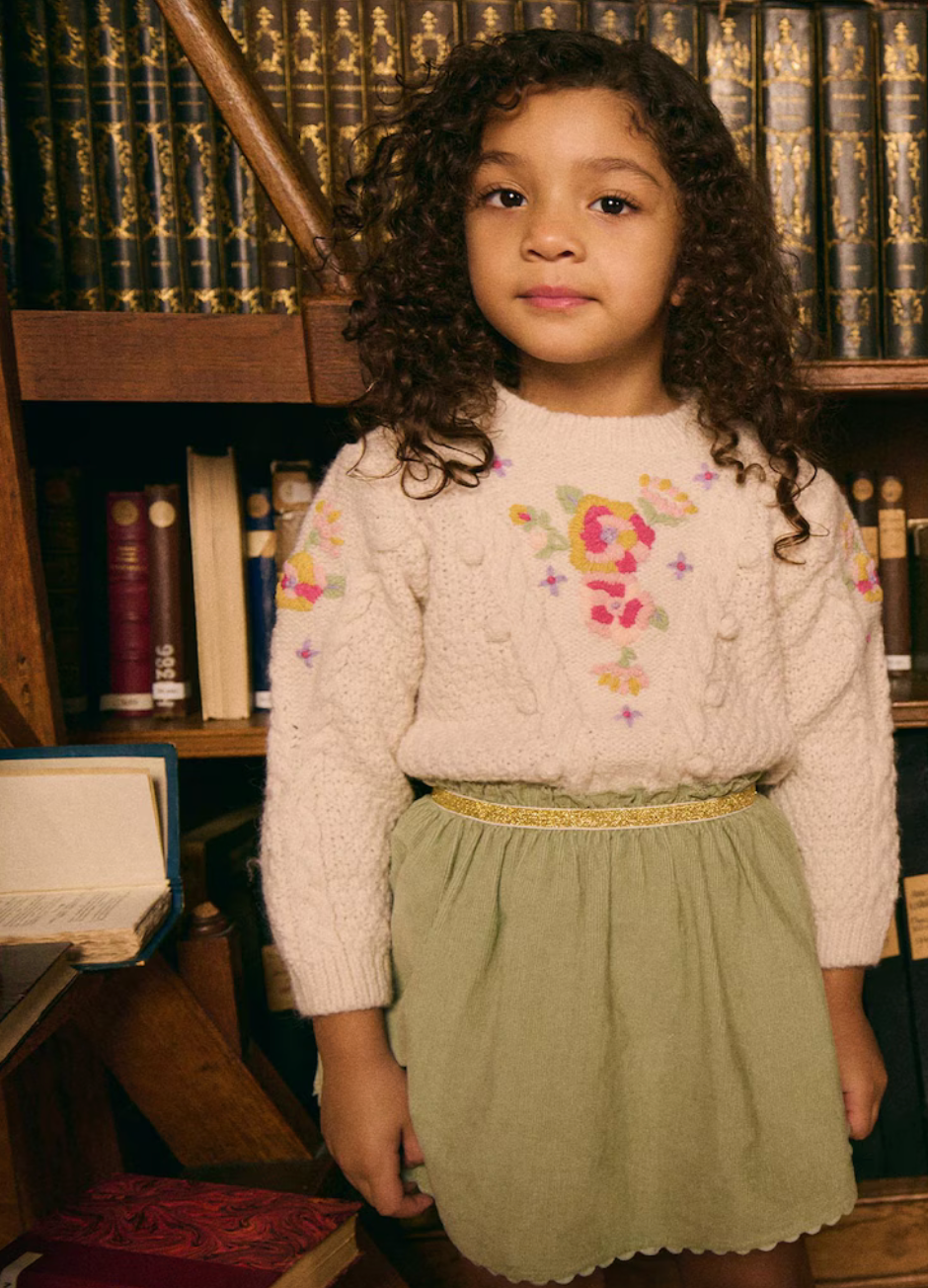 - Solid color knit sweater adorned with hand-embroidered flowers on front and sleeves.