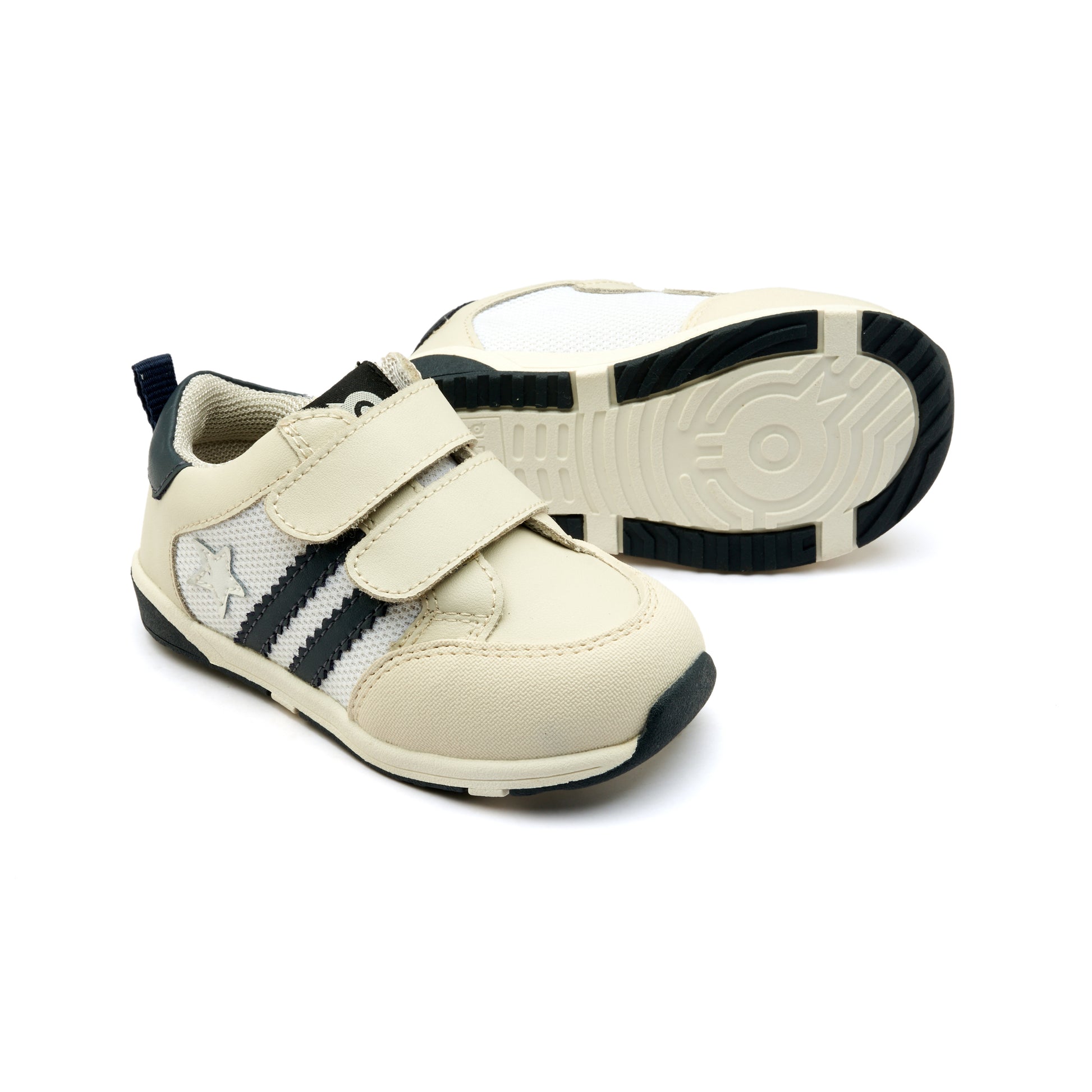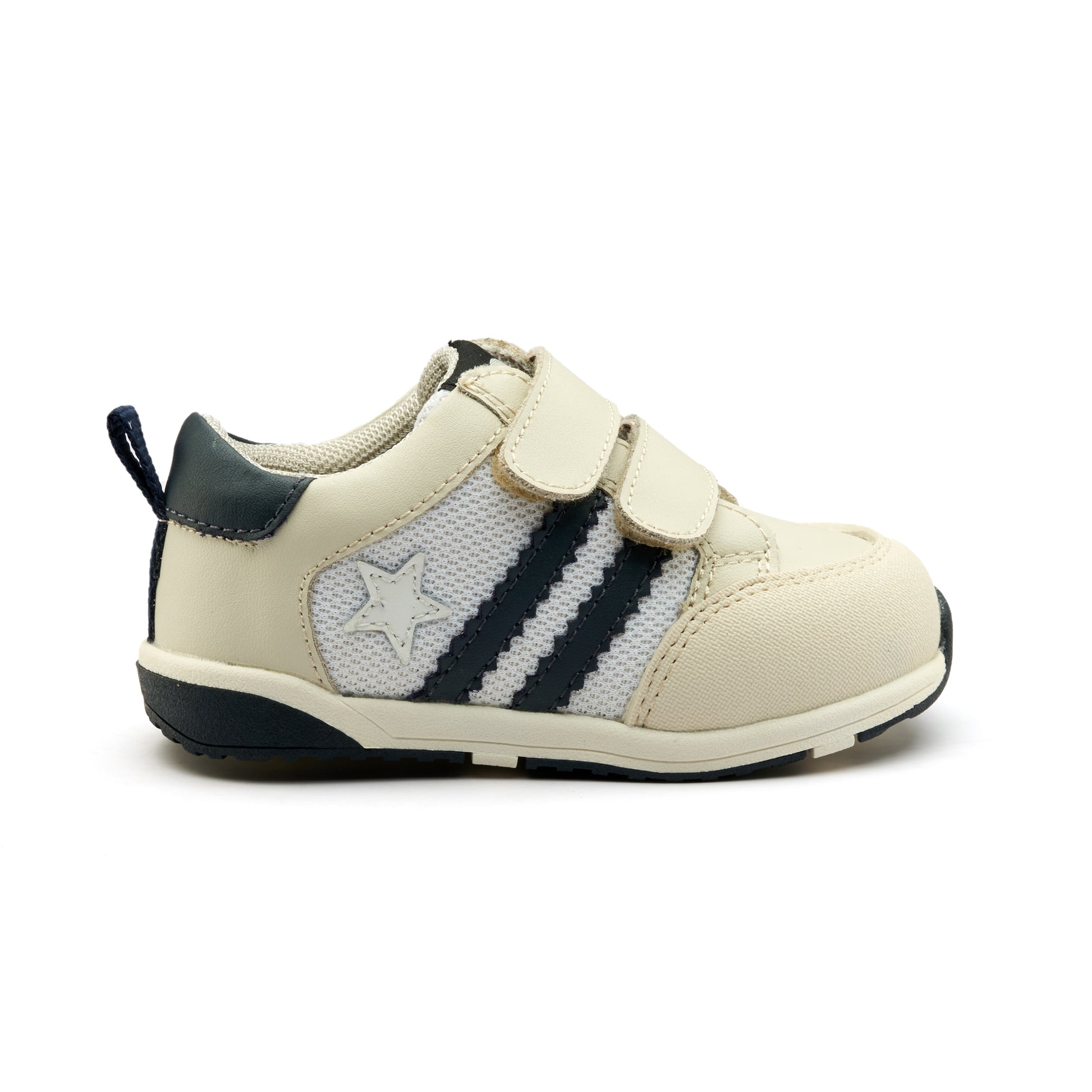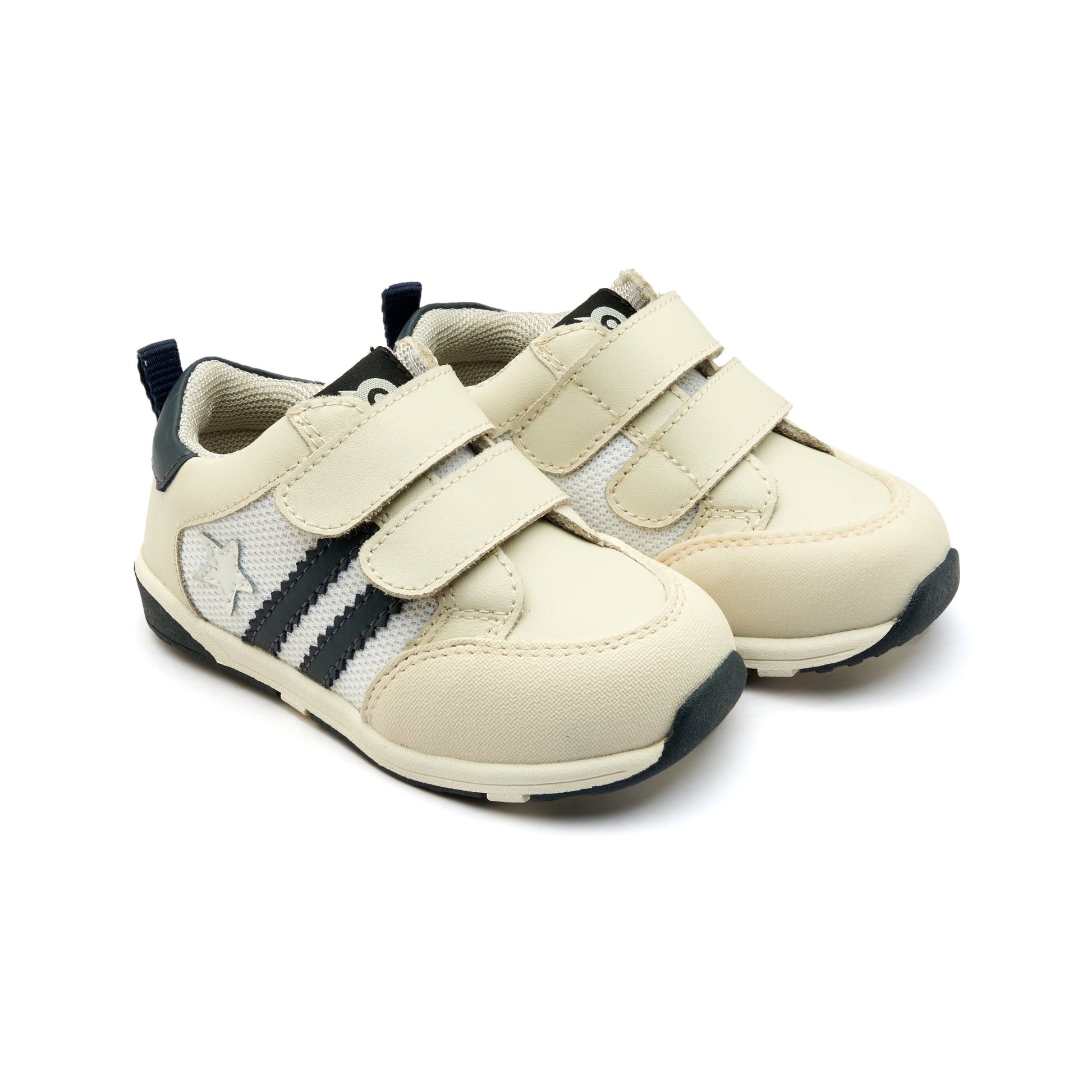 Field Squad sneakers are low-profile kids' trainers with a sporty silhouette and dual velcro straps. They feature a mix of mesh and faux-leather panels in a neutral cream and navy palette for easy wear and breathability. Designed them for everyday play with a cushioned sole and reinforced toe for extra durability.